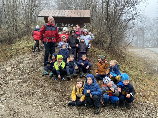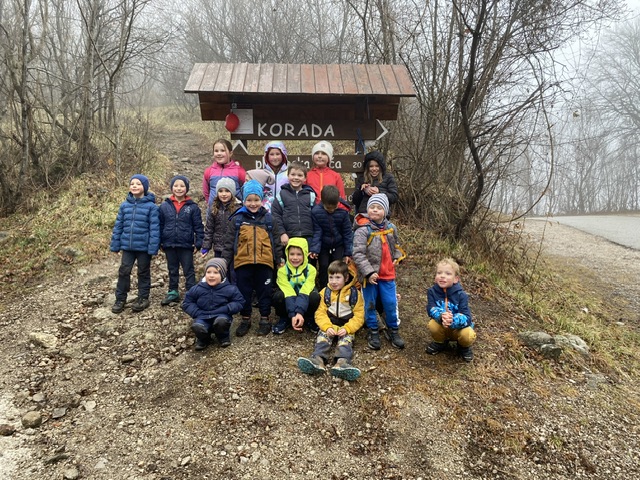 Kljub manj ugodnim vremenskim razmeram smo se v lepem številu zbrali pri odcepu za Senik in se podali proti Strmcu do lovske koče. Zaradi spolzkega terena in nevarnosti zdrsa smo nekoliko prilagodili pot in večji del poti prehodili po asfaltni cesti. Nato smo nadaljevali po položni gozdni poti, ki nas je pripeljala do planinske koče na Koradi. Tam smo si privoščili zasluženo malico in se odpočili, ob tem pa nam je vodnik Oskar v planinsko knjižico vtisnil še žig.