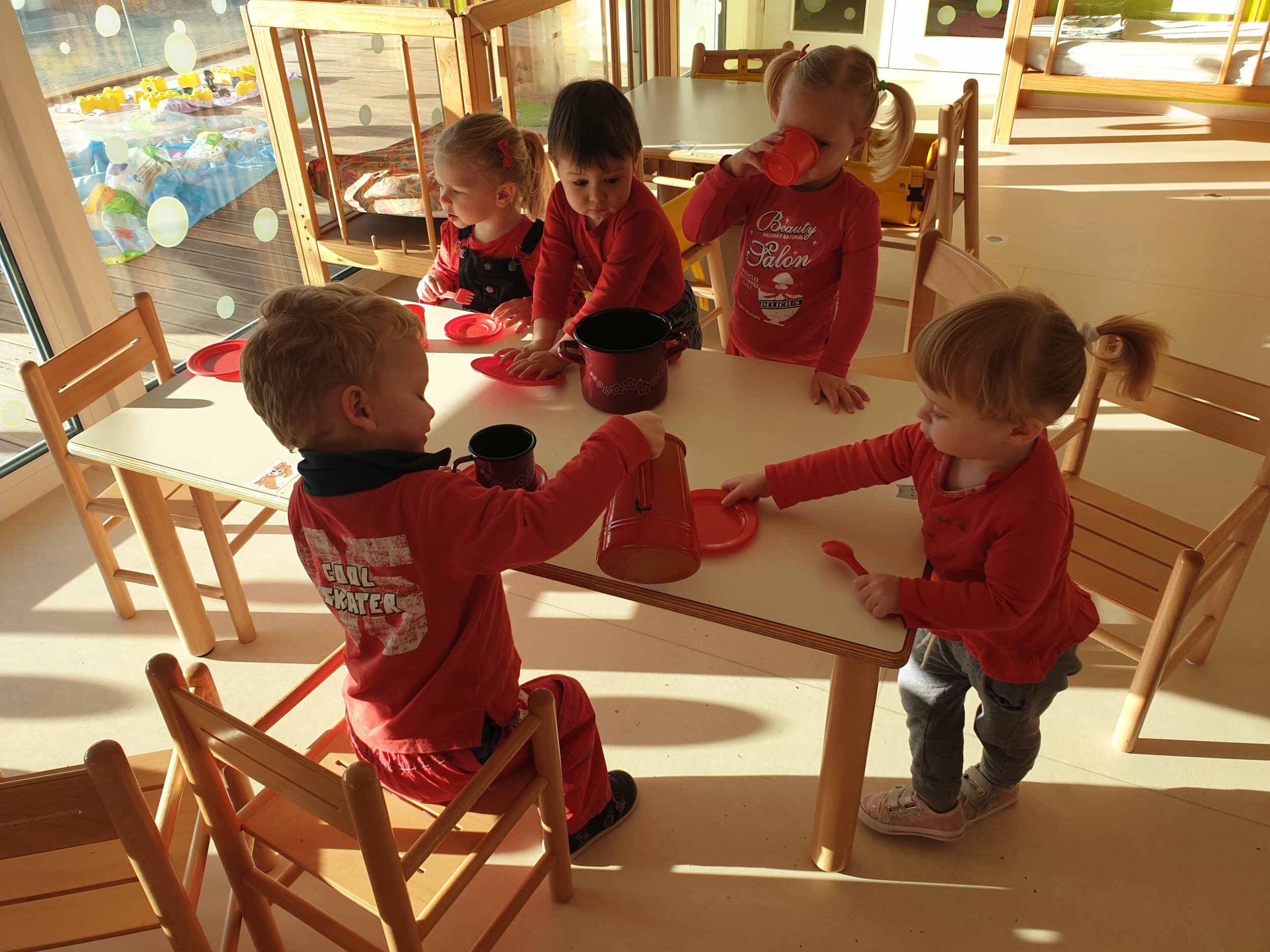 V januarju smo se pri Račkah veliko ukvarjali z barvami. Spoznali smo pisanega slona Elmerja in njegove dogodivščine ter uživali v rimah Andreja Rozmana Roze. Igrali smo se z barvo, tako, da smo slikali z rokami in prsti ter odtiskovali odpadno embalažo. Nizali smo barvne kroglice, se igrali z žogami, kockami in plastelinom različnih barv. Zabavali smo se z ročnimi lutkami – barvnimi možici, ki živijo v barvnih žepih predpasnika. Različne predmete smo razvrščali po barvah in spoznali drevesni diagram. V petek je bilo še posebej zabavno, saj smo praznovali Rdeči dan, ko smo v vrtec prišli oblečeni v nekaj rdečega.