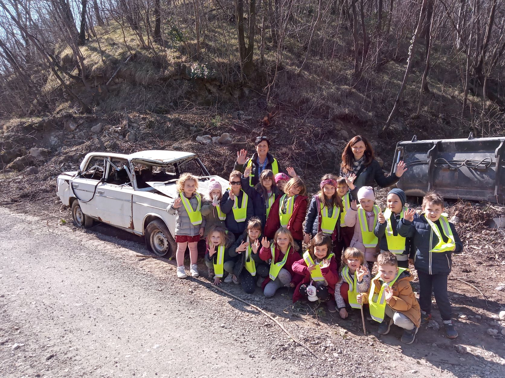 Na sprehodu v okolici vrtca pa smo z otroki opazili zapuščen avtomobil. Otroci so zaznali problem. Veliko smo se pogovarjali o tem, da smeti in drugi odpadki ne spadajo v naravo, temveč na primerna odlagališča.