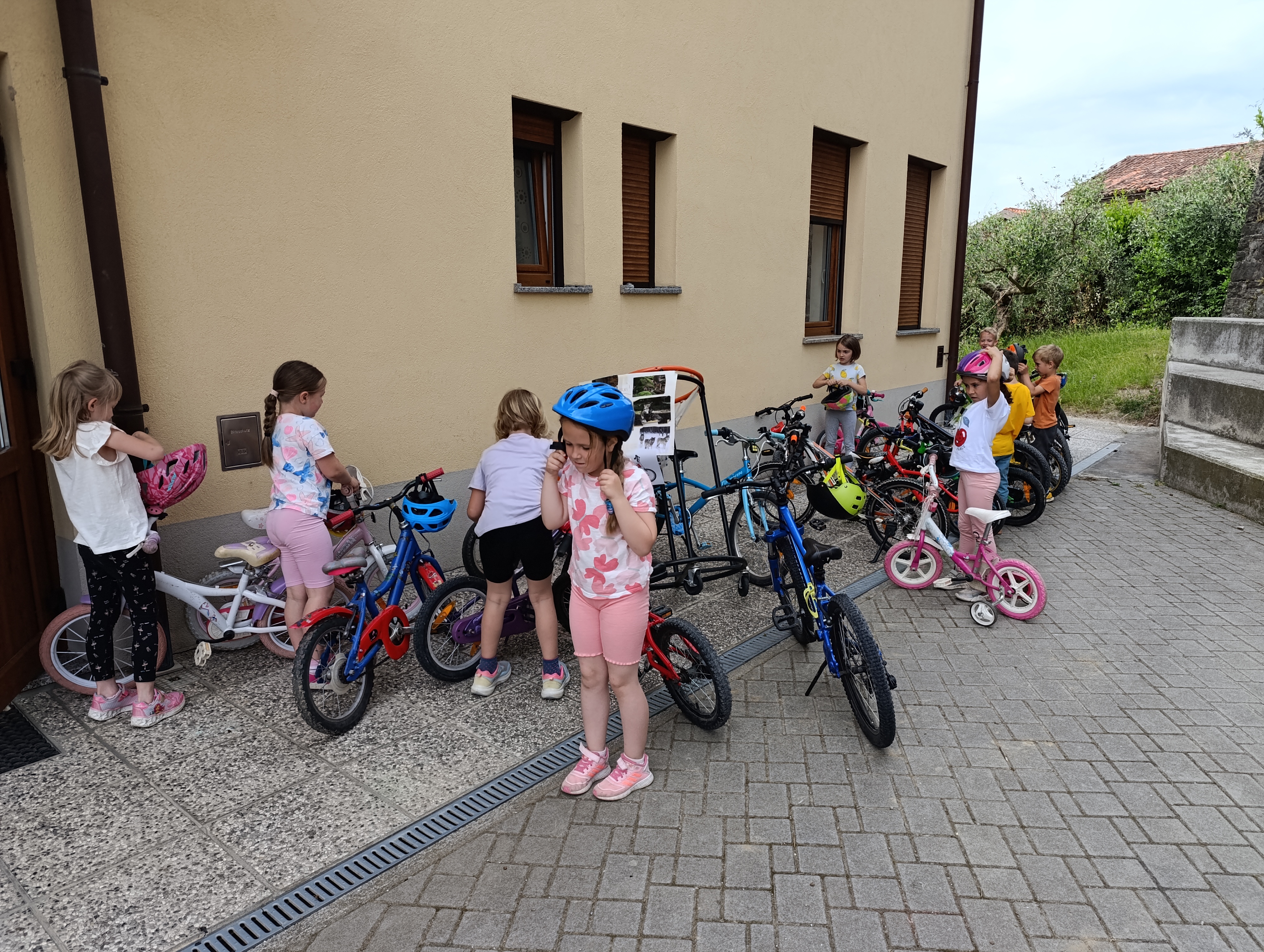 V okviru projekta »Mali sonček« otroci pridobivajo znanja iz različnih gibalnih spretnosti. Vzgojiteljice skozi celo leto pripravljamo specifične gibalne dejavnosti.Tokrat smo se v starejših slupinah lotili kolesarjenja.Otroci so v vrtec pripeljali svoja kolesa in seveda tudi čelade. Najprej smo si pogledali kaj spada pod obvezno opremo kolesa: brezhibna prednja in zadnja zavora, luč spredaj in zadaj, zvonec, odsevniki na pedalih, ustrezno napolnjene pnevmatike ter primerno nastavljena višina krmila in sedeža. Na igrišču sta nas pričakala policista, ki sta za nas pripravila poligon s prometnimi znaki. Najprej smo si prometne znake ogledali in razložili njihov pomen nato pa smo se usedli na kolo. Vijugali smo med stožci, se varno zaustavljali in bili pozorni na druge kolesarje. Za konec smo svoja kolesa še narislai.