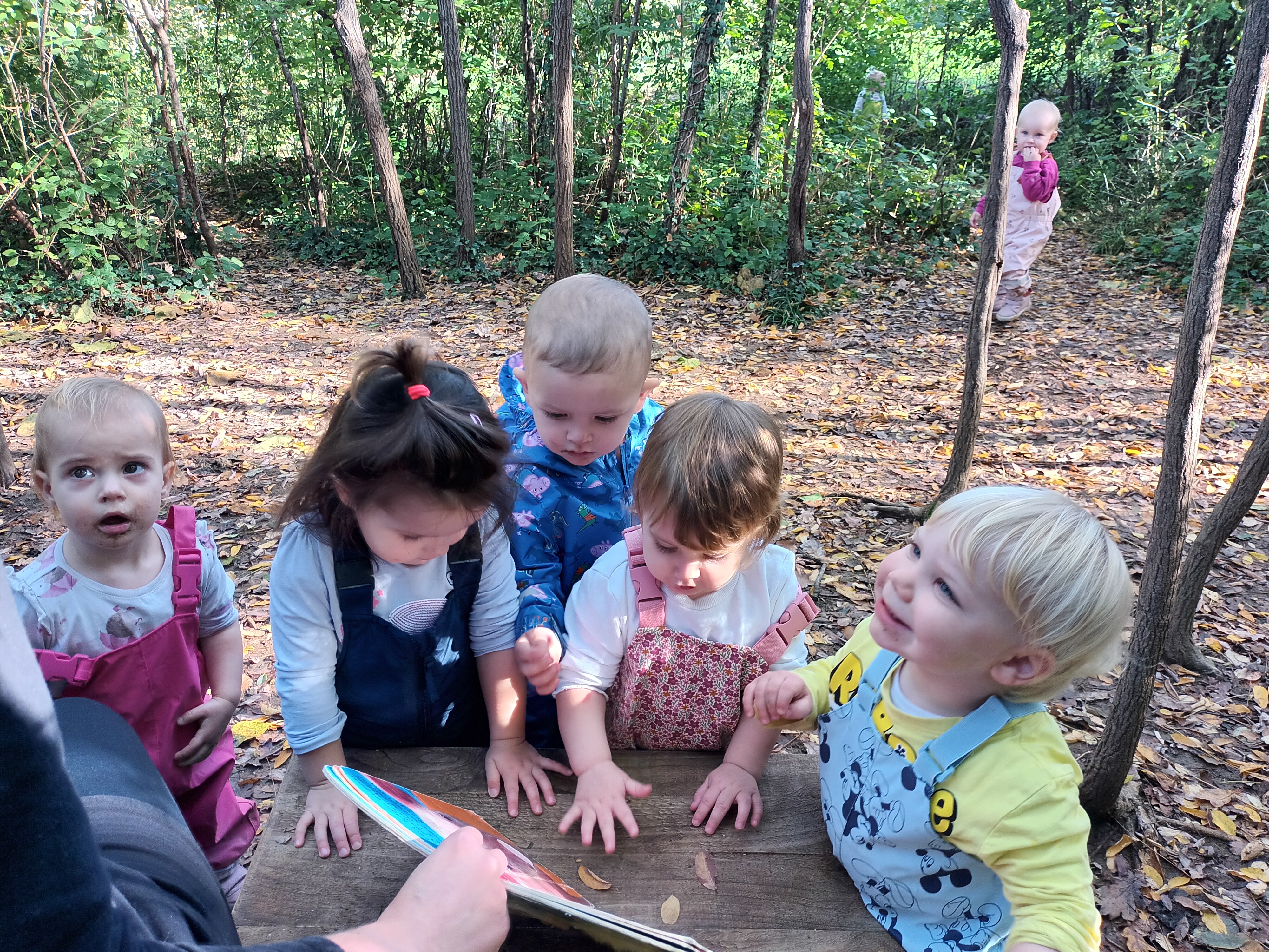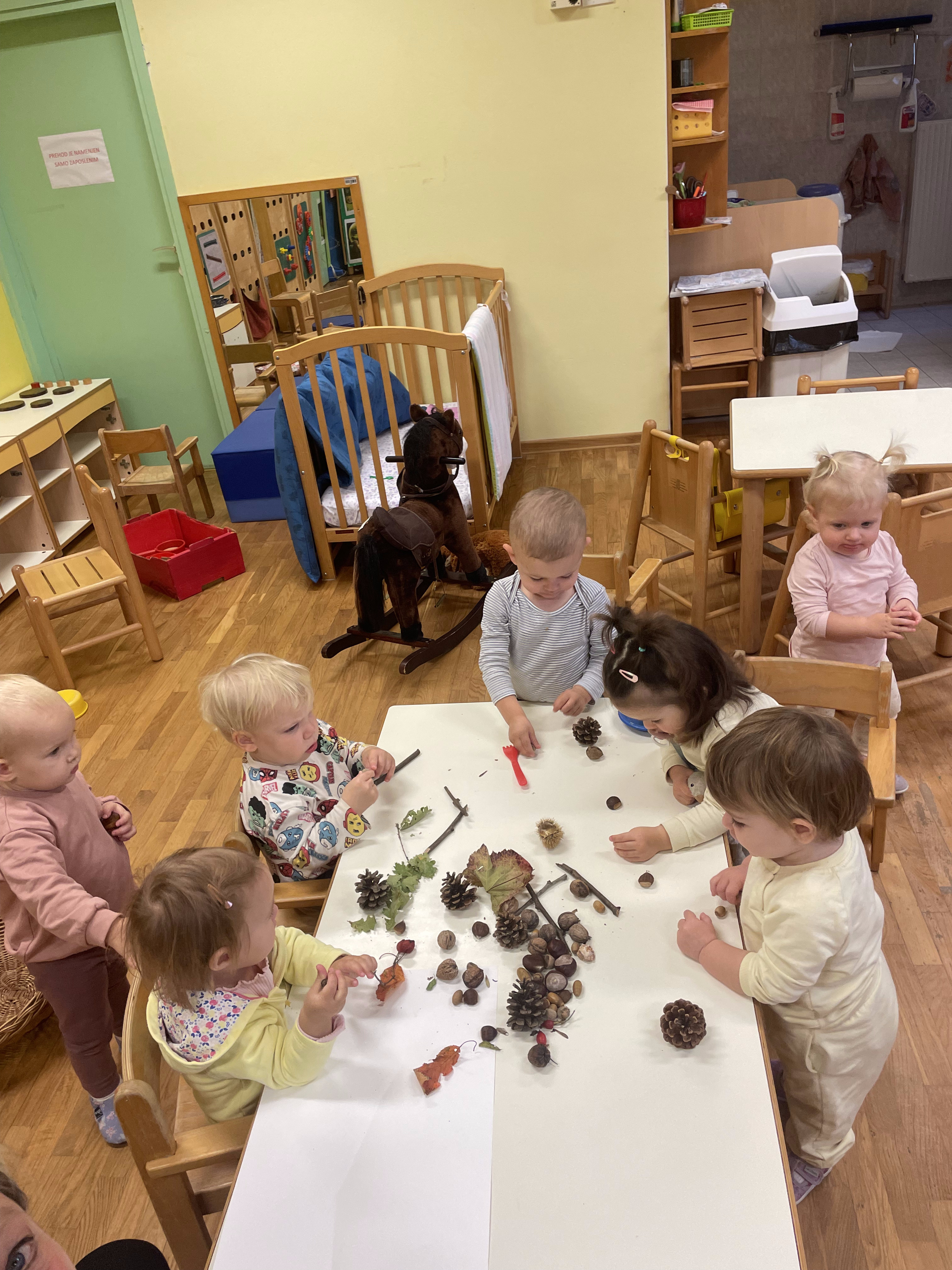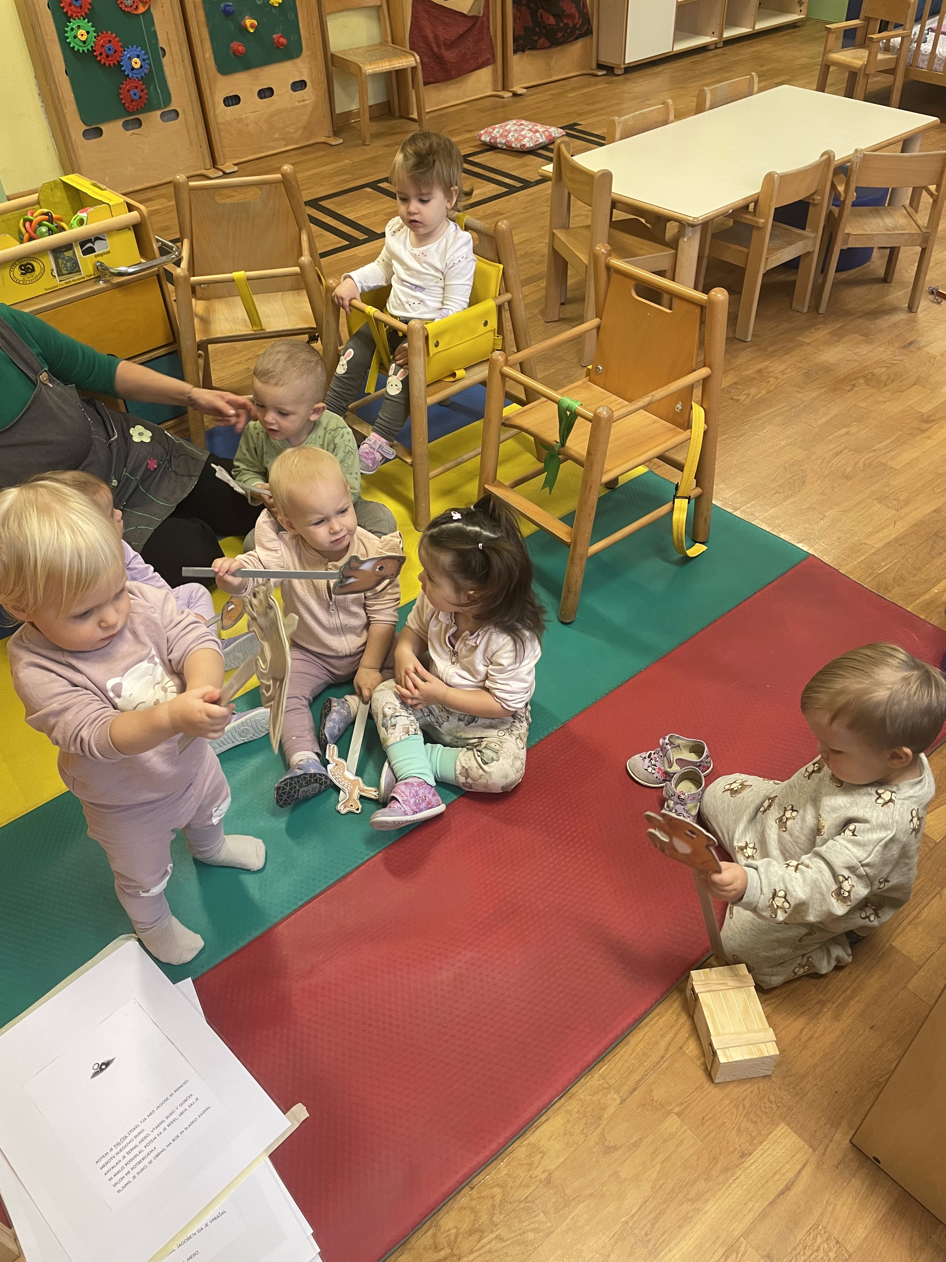 Mali medo ne more zaspati brez dude. Zajec, srnica in volk mu želijo pomagati. Na koncu priskoči na pomoč še čisto pravcati palček. Mali medo, pa ne potrebuje več dude«. Tako smo v Roza igralnici izvajali različne dejavnosti na to temo. Oponašali smo gibanje živali, pobarvali svoj čarobni kamenček, improvizirali z lutkami na palčki. Veliko časa smo namenili gibanju v naravi ter raziskovali naravni material, ki so ga starši prinašali v vrtec.