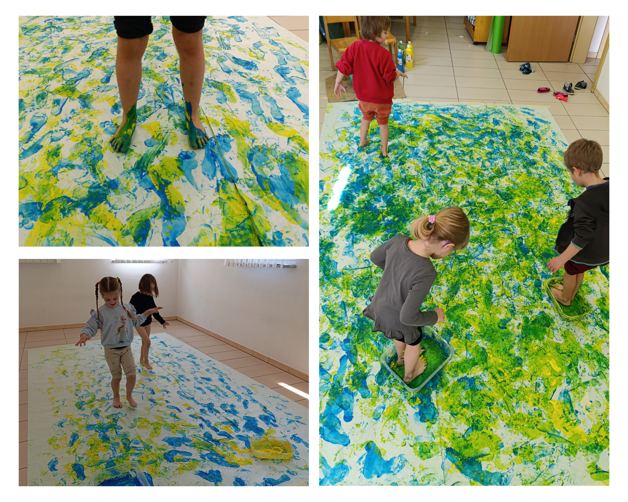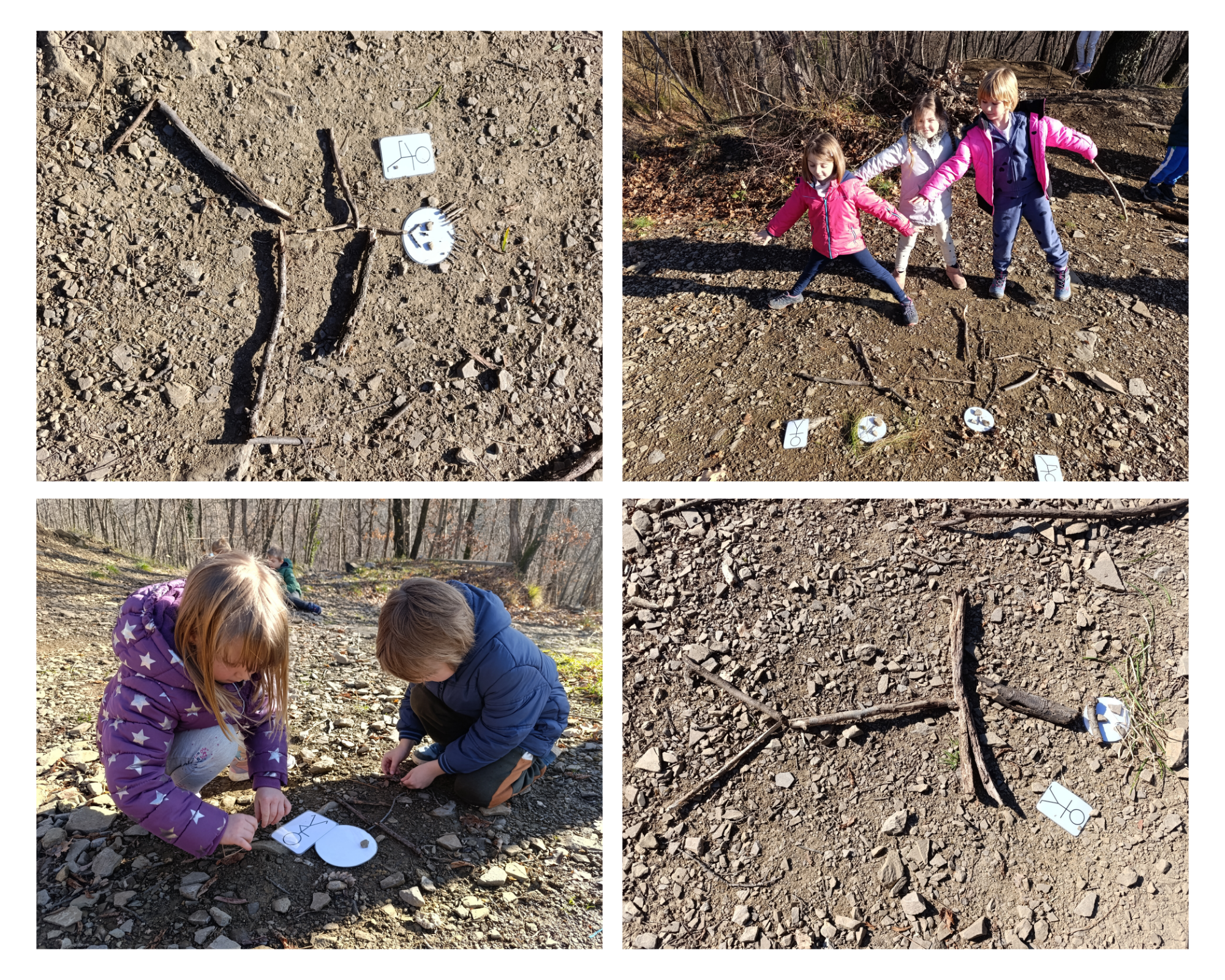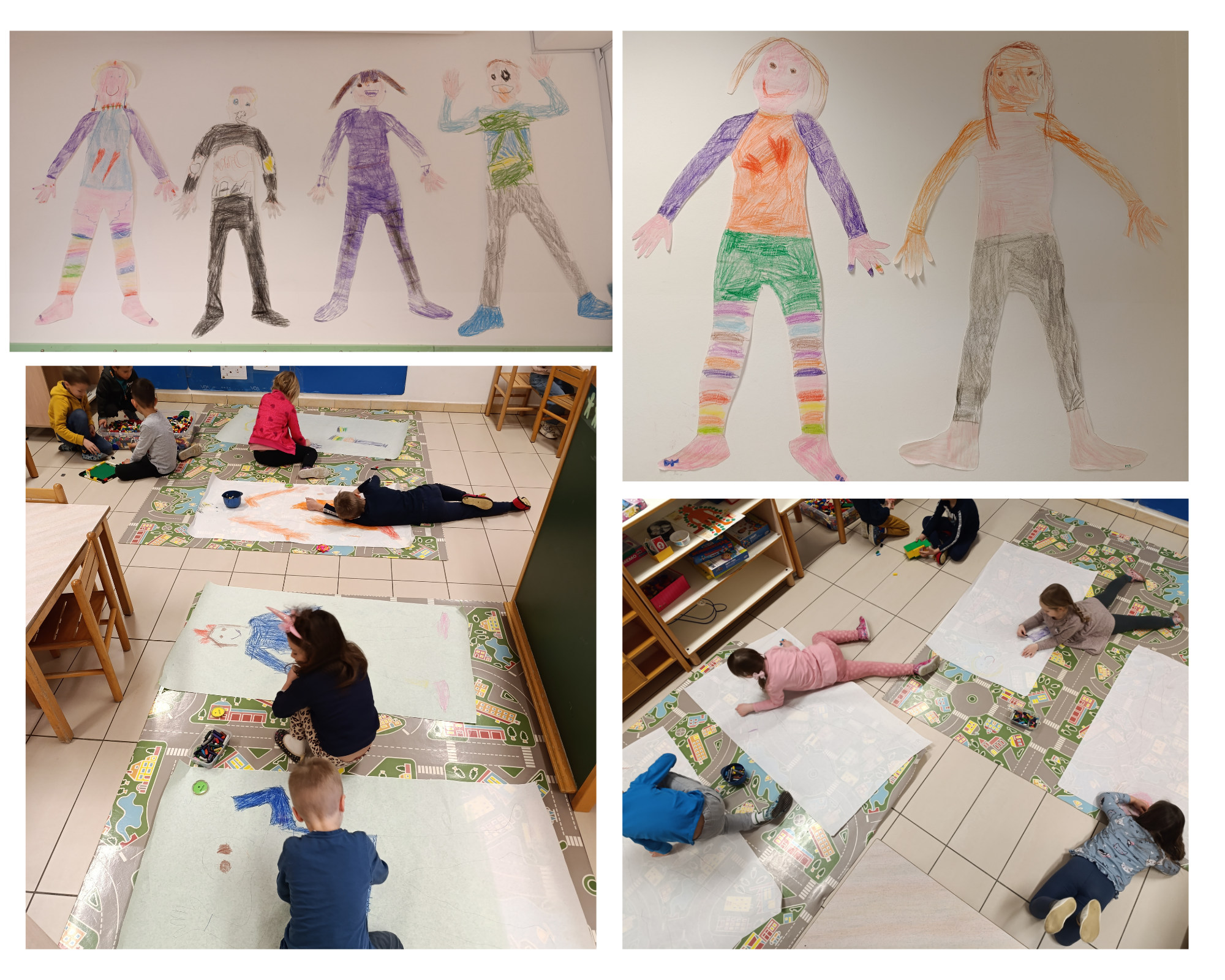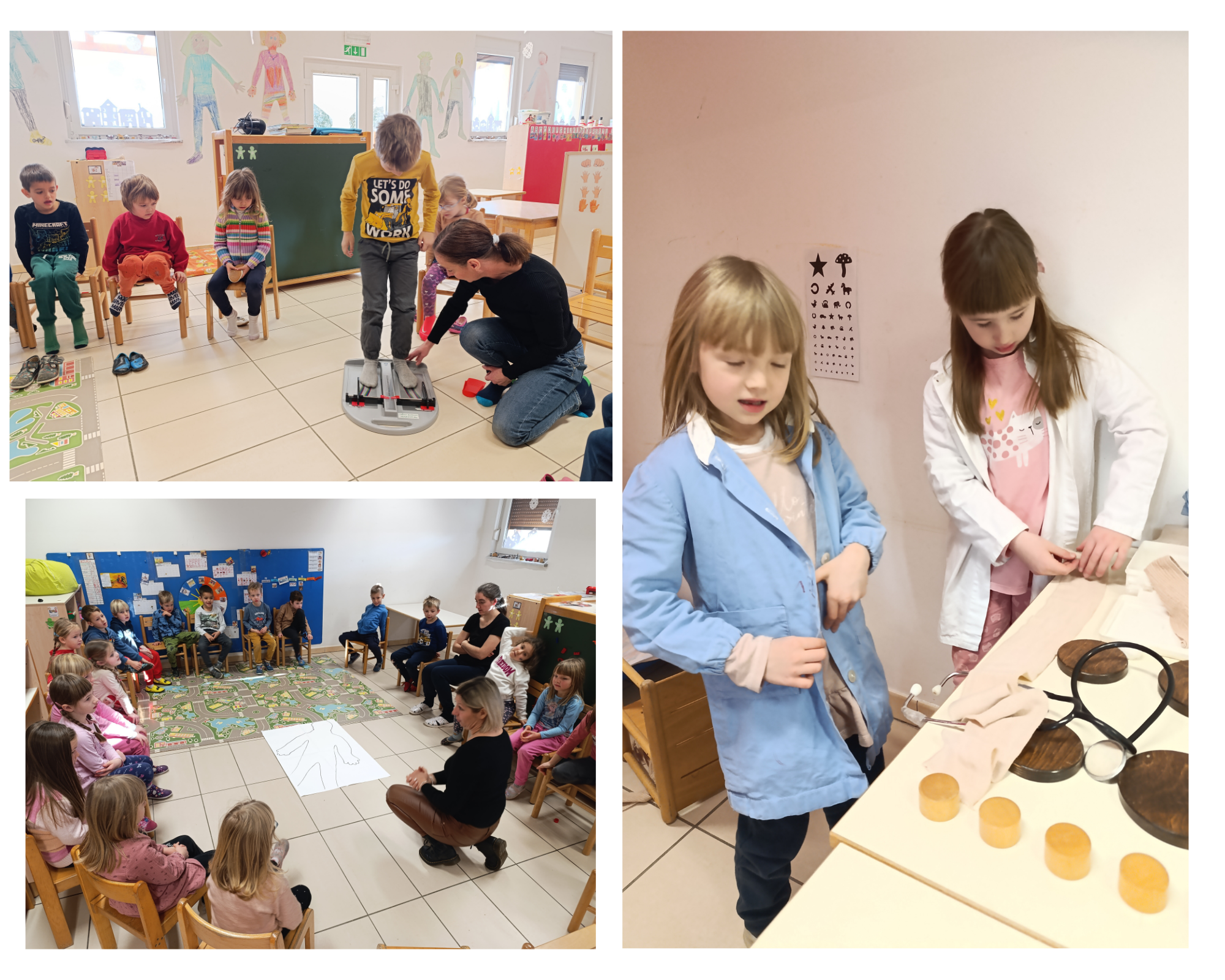Na velik list papirja smo obrisali svoje telo in ga pobarvali. Izmerili smo našo višino in tako ugotovili kdo je v naši igralnici najvišji in kdo najnižji. Obiskala nas je ga. Suzana, mama naše Eli, ki je prodajalka v trgovini čevljev in nam pokazala kako izmerimo velikost stopala in tako izberemo ustrezno velikost čevlja. Tako smo ugotovili kdo ima v naši skupini največje in kdo najmanjše stopalo in kdo bo kmalu potreboval nove copate.  V ogledalu smo opazovali svoje oči ter obraz  ter izdelali lepljenko. Zelo radi pa se igramo tudi v naši ambulanti, kjer s povoji povijamo poškodovane noge in zdravimo  najrazličnejše bolezni.  V Biljani zelo veliko časa preživimo v gozdičku, kjer najlažje spoznamo kaj vse naše telo zmore.  V gozdičku smo iz različnih palic izdelali figure v različnih položajih, ki smo jih prikazali tudi  s svojimi telesi. Obraze pa so dobila tudi drevesa v našem gozdičku.