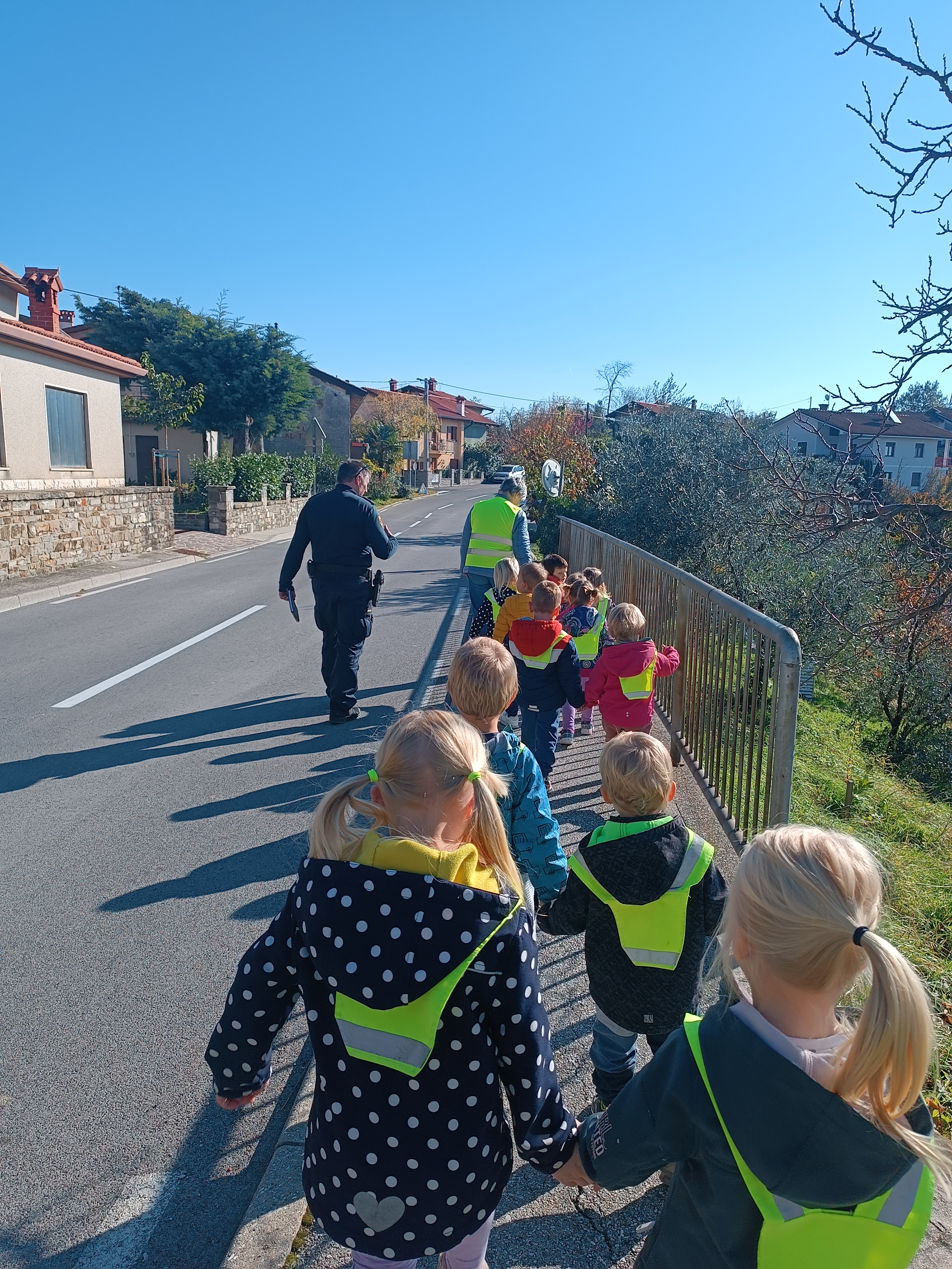Povedal nam je, kako se pravilno vozimo v avtomobilu, kje in kako moramo otroci v vozilu sedeti. Pogovarjali smo se še o varnem sprehodu in se potem s policistom tudi odpravili na sprehod proti Svetemu križu-pokazal nam je, kako najvarneje prečkamo cesto brez prehoda za pešce. Ponosni smo bili, ko nas je pohvalil, da že kar dosti vemo ter znamo lepo in varno hoditi ob cesti.