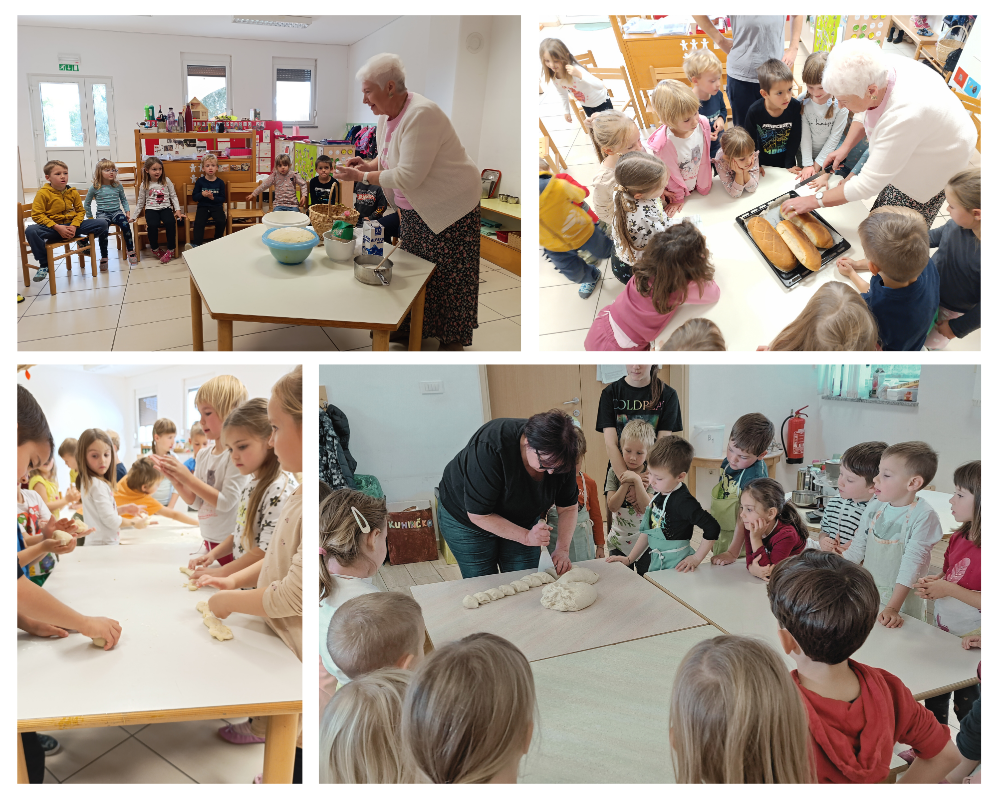 Ob pomoči none Marije in Jožice pa smo si spekli kruh. Tako smo si pripravili vse potrebno za tradicionalni slovenski zajtrk in ob njem zelo uživali.