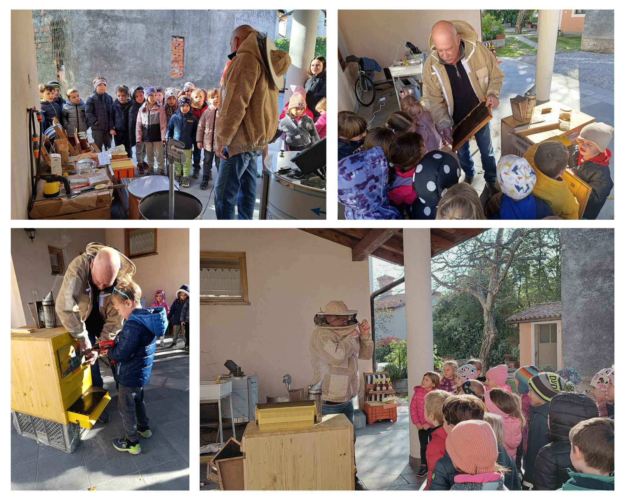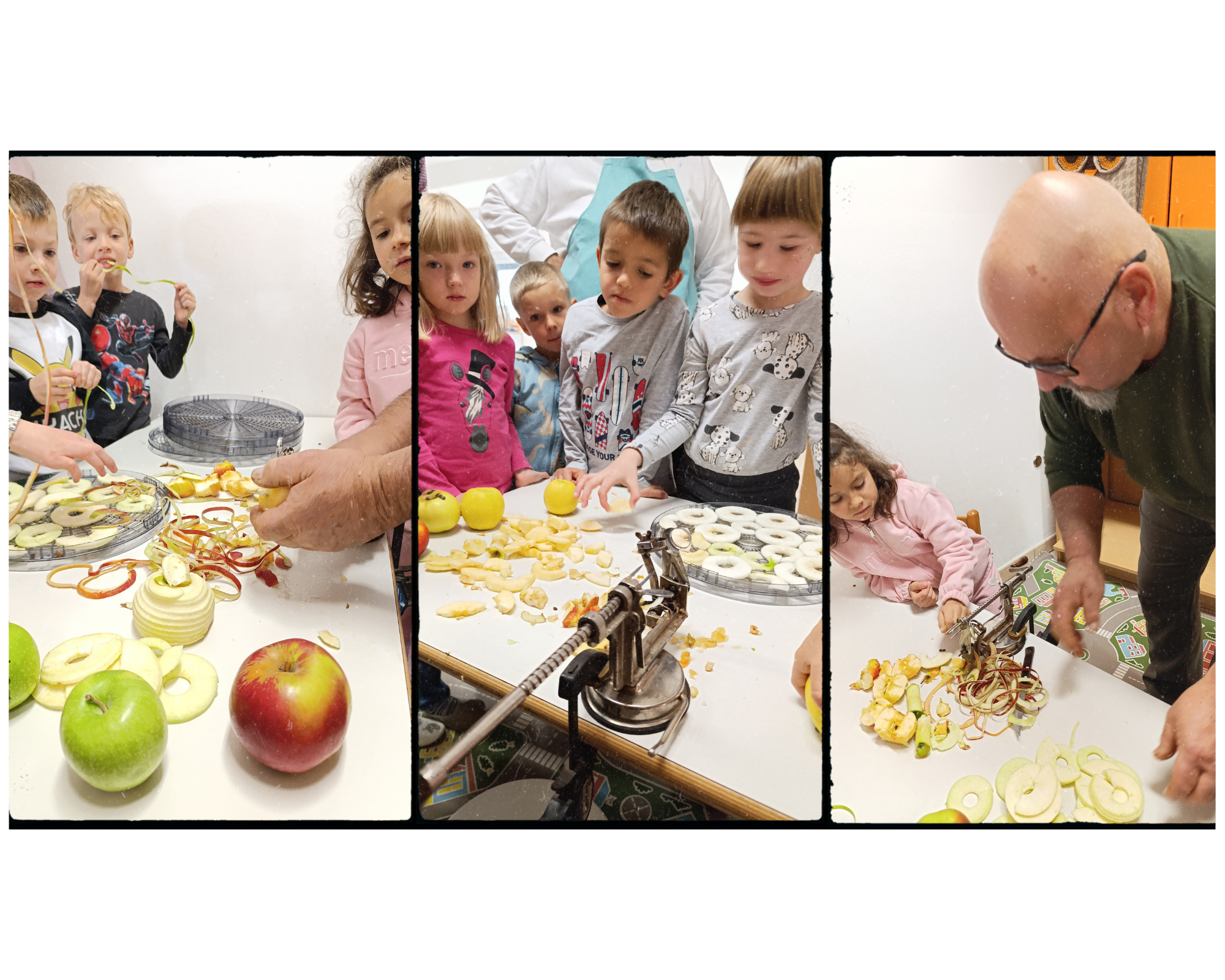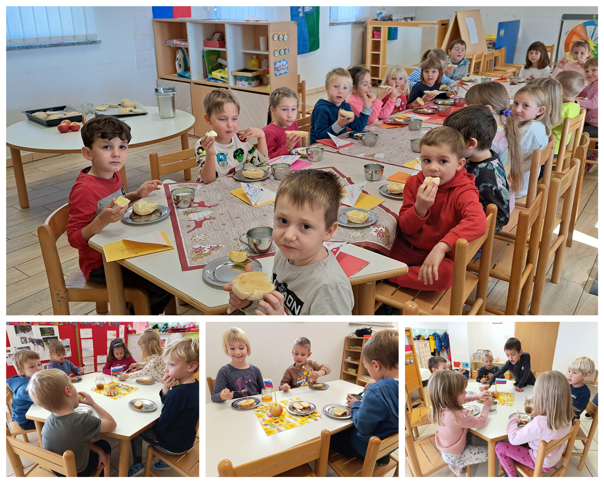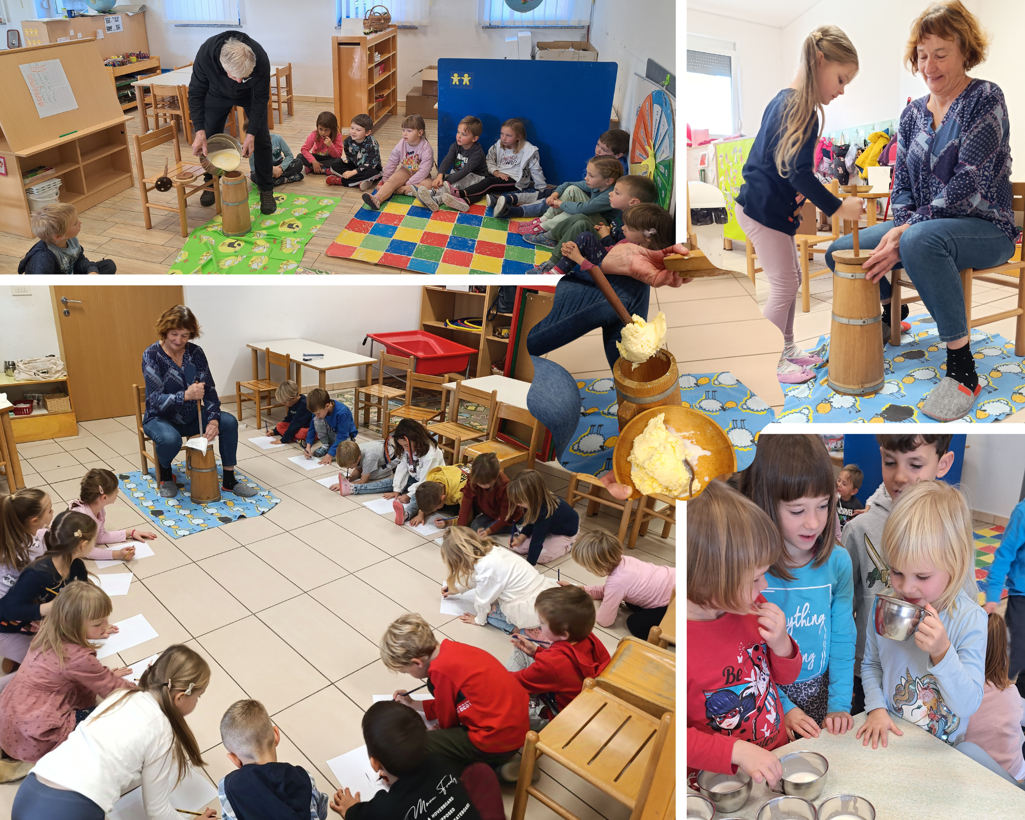 V vrtcu v Biljani smo v sklopu projekta medgeneracijskega sodelovanja v vrtec povabili naše none in nonote. Z njihovo pomočjo smo sami pridelali večino sestavin slovenskega zajtrka. V ponedeljek sta nas obiskala nona Nevenka in nono Valter in s seboj prinesla zanimiv pripomoček. Pokazala sta nam kako z njim olupita jabolka in jih narežeta na krhlje ter jih tako pripravita za sušenje. Jabolk ne bi bilo brez čebel, prav tako pa ne medu. Čebelar Danilo Podvršček, ki smo ga obiskali na n jegovem domu, nam je povedal veliko zanimivih stvari o čebelah in nam pokazal kaj vse uporablja pri svojem delu. Pogostil nas je s sladkimi medenimi lizikami in nam podaril med, s katerim smo se sledkali na tradicionalnem zajtrku. V sredo in četrtek sta nam nona Bogdana in nono Joško prikazala postopek izdelave masla v pinji. Poskusili smo tudi pinjenec in domači jogurt.