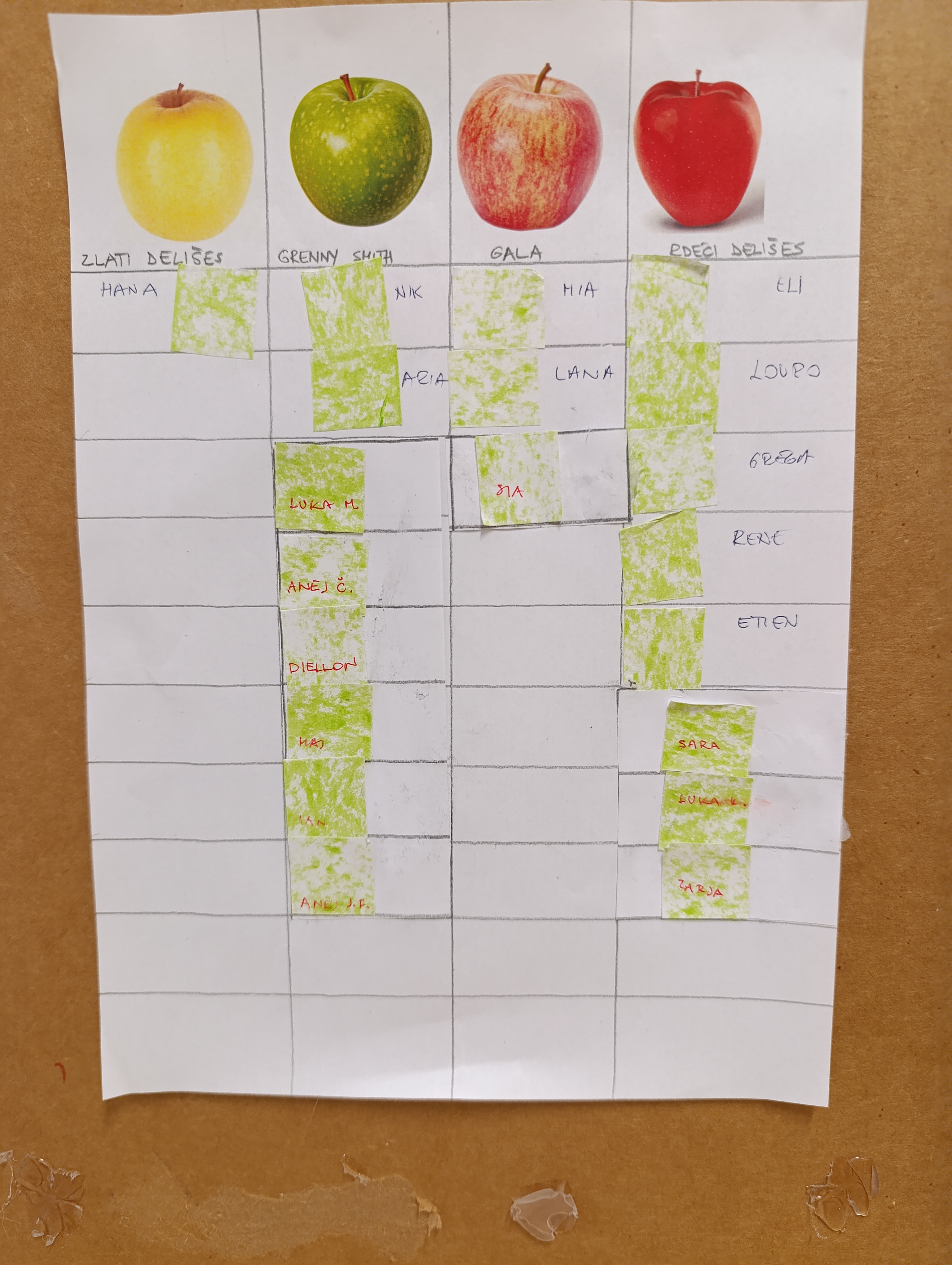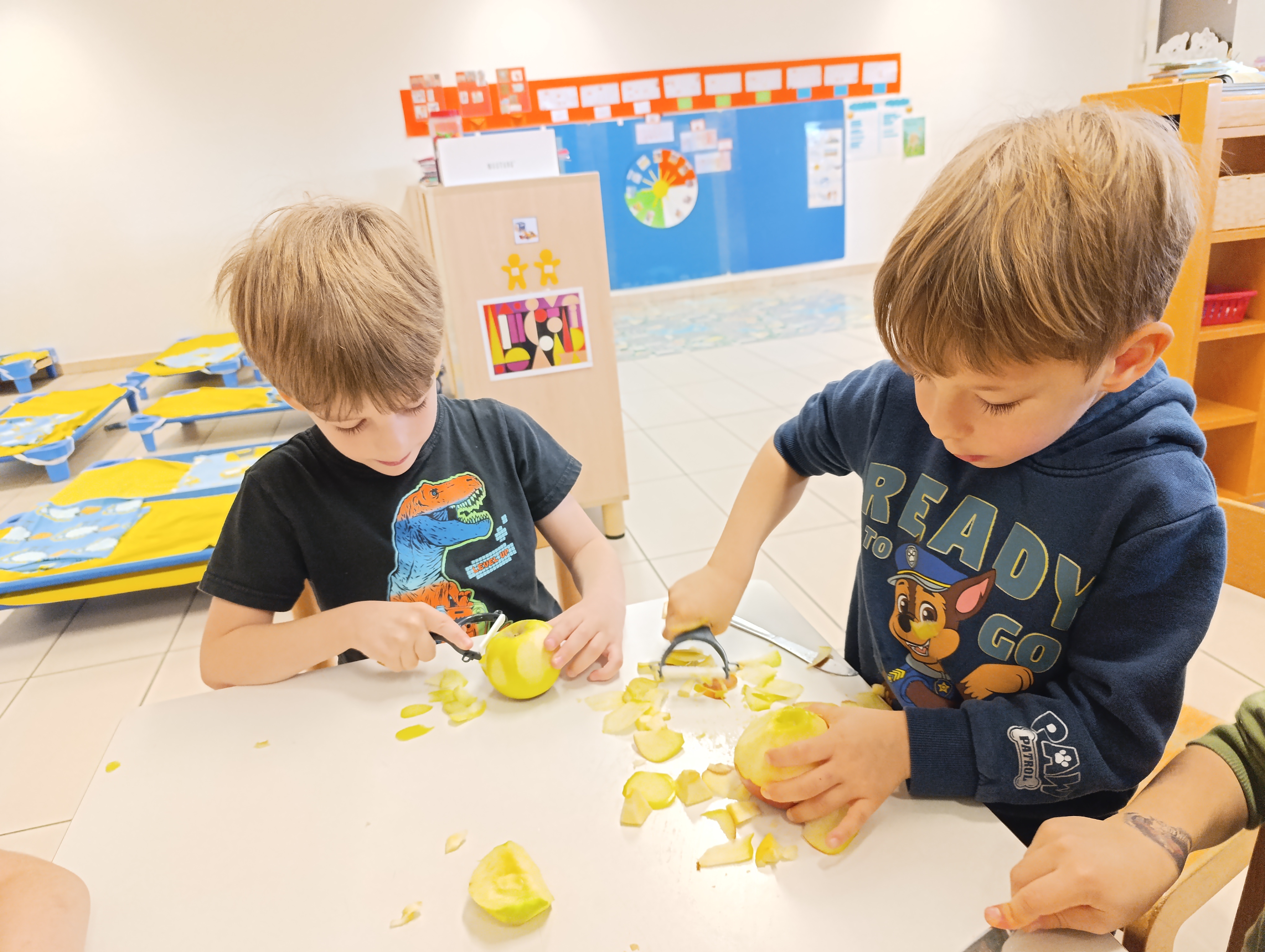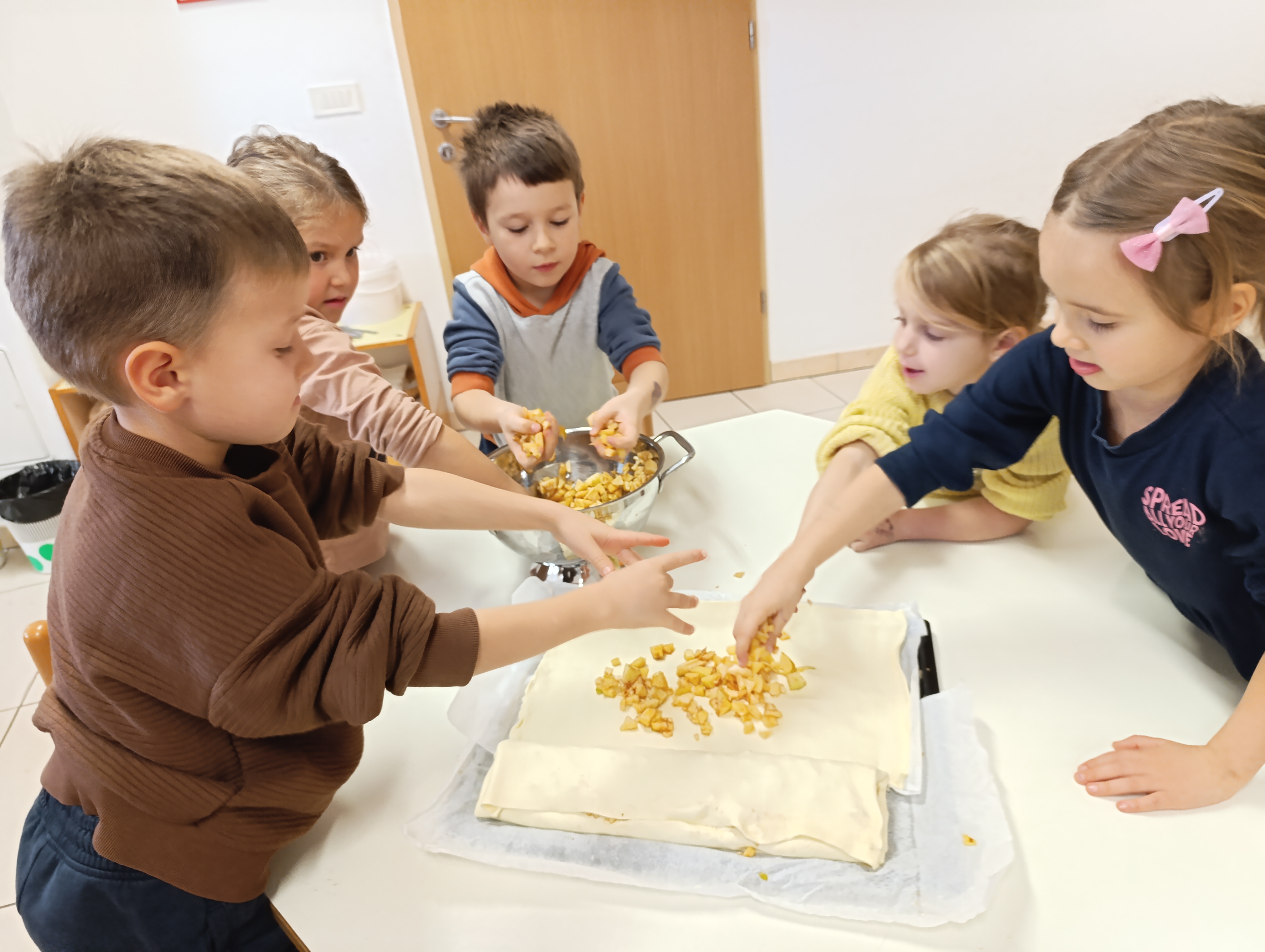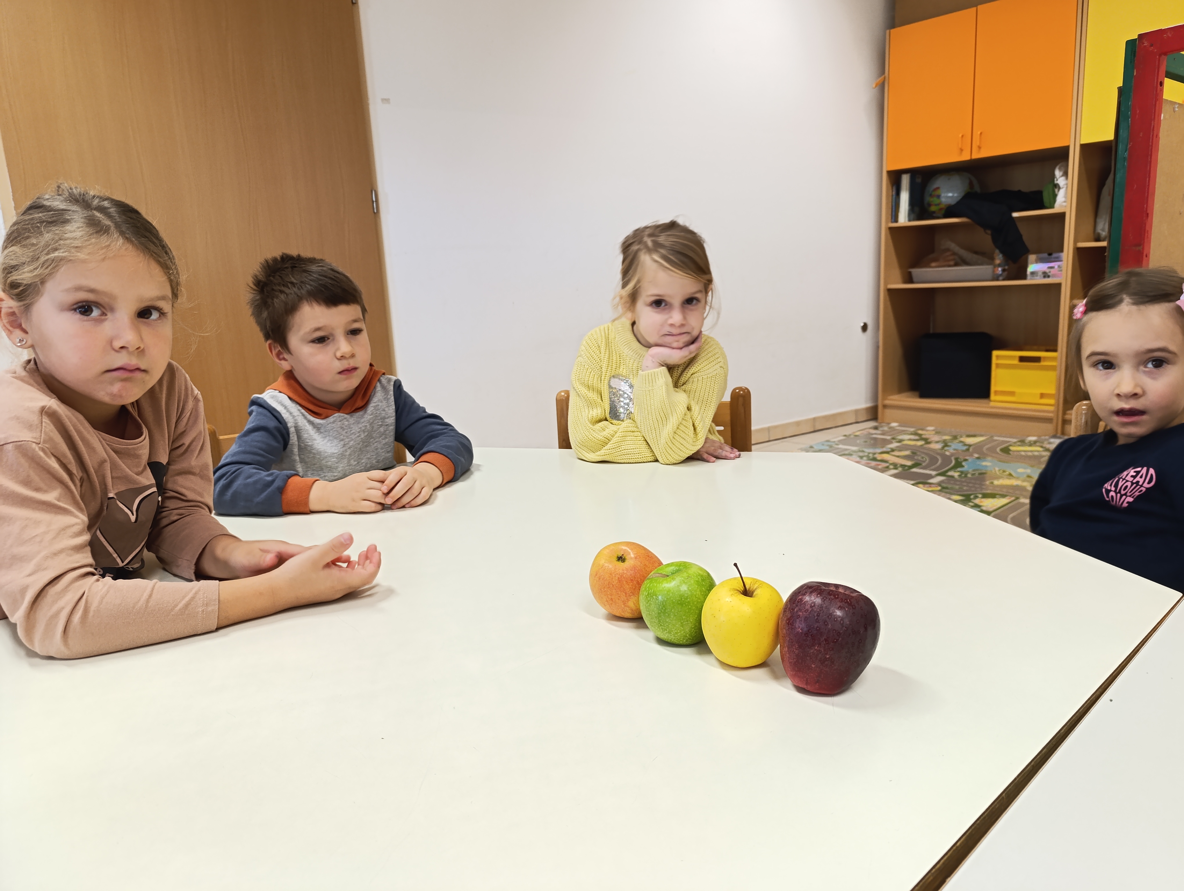Najprej smo se posvetili jabolku. Ugotovili smo, da obstaja več sort jabolk, ki se razlikujejo po barvi, obliki, vonju in okusu. Vsako jabolko ima tudi svoje ime. Po degustaciji so otroci povedali, katero jabolko jim je bilo najbolj všeč. Iz jabolk smo nato pripravili jabolčni zavitek. Otroci so jabolka olupili, narezali in z njimi nadevali testo. Z zavitkom smo se posladkali pri kosilu.