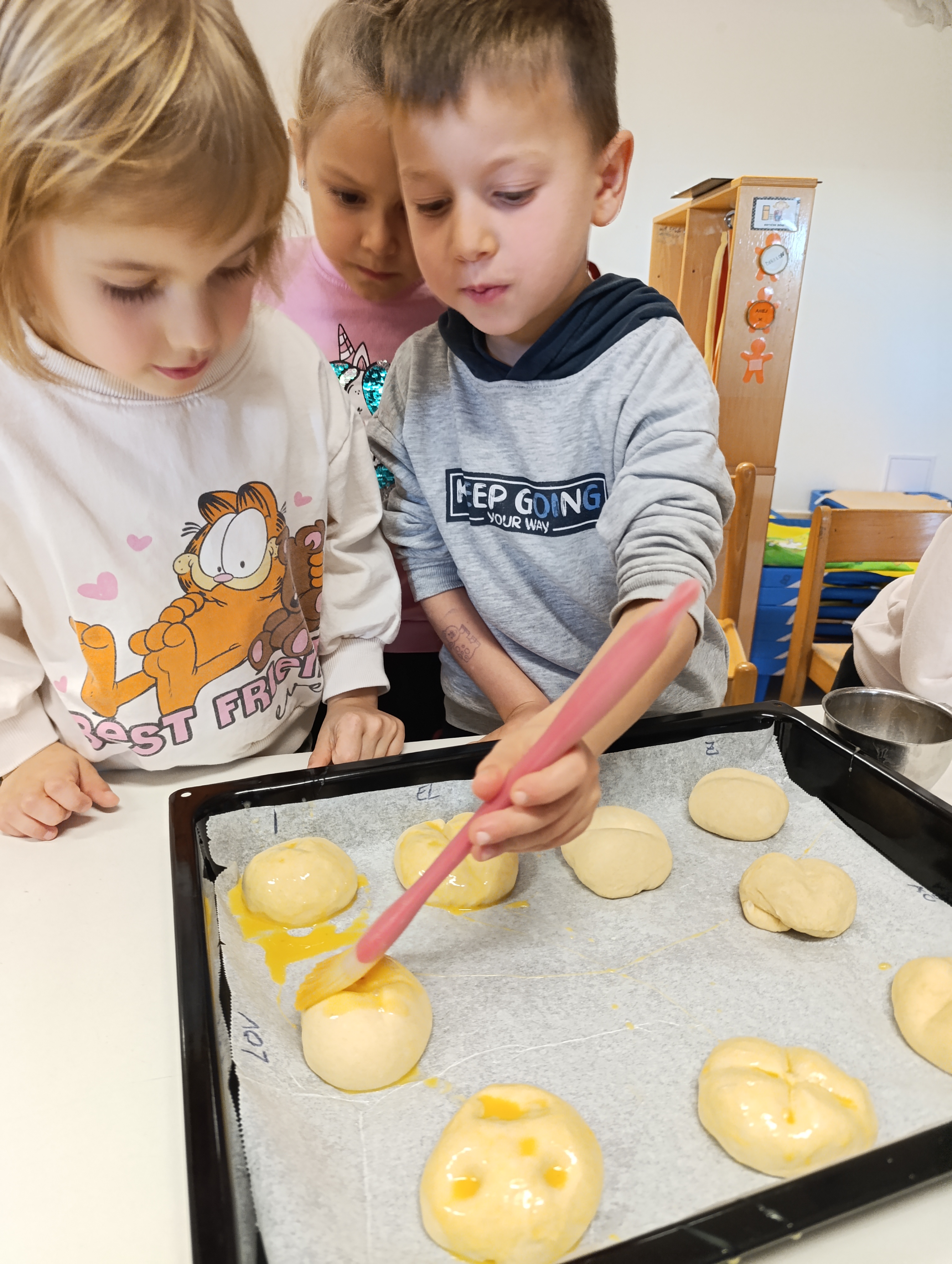 V sredo je v našem vrtcu spet prijetno zadišalo, tokrat po kruhu. Preko videoposnetkov smo si najprej ogledali pot od žita do kruha. Tako smo spoznali, iz česa in kako nastane moka. Nato smo pripravili kvasec in z zanimanjem opazovali, kako kvas "oživi", ko ga zmešamo s toplo vodo, in kako nastajajo mehurčki. Najbolj zabaven del je bilo gnetenje – vsak otrok je dobil svoj košček testa in iz njega oblikoval žemljico. Kruh smo pojedli za popoldansko malico.