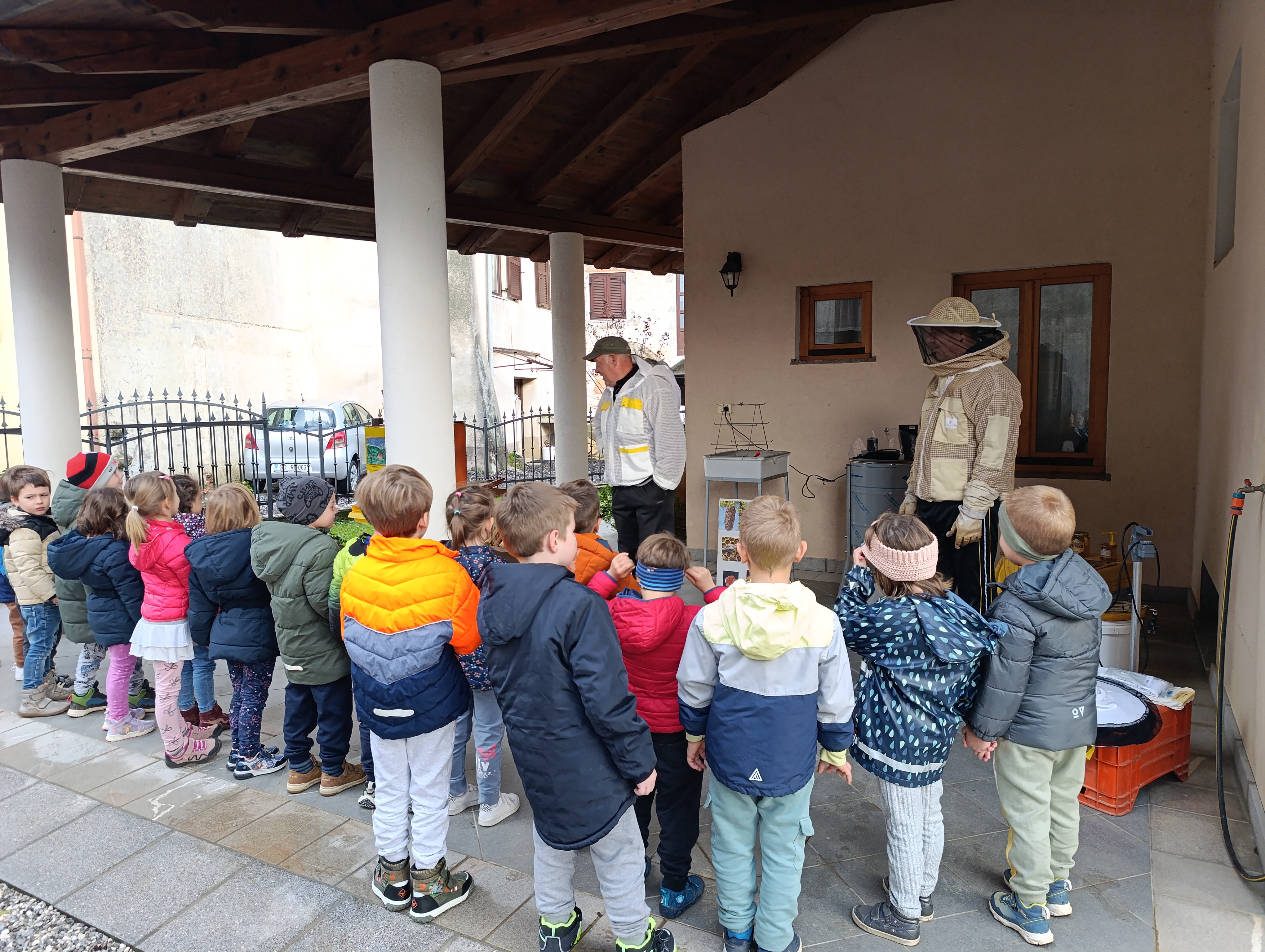 V četrtek smo obiskali čebelarja Danila Podvrščka, ki nas je prijazno sprejel in nam povedal veliko zanimivosti o čebelah, na primer da imajo čebele pet oči. Otrokom je na preprost in zanimiv način predstavil čebeljo družino, ki jo sestavljajo matica, delavke in trot, ter razložil, kako čebele sodelujejo in skrbijo za panj. Pokazal nam je tudi čebelarske pripomočke, kot so zaščitna obleka, kadilnik in okvirji, ter pojasnil, kako čebelar uporablja te pripomočke pri svojem delu.
