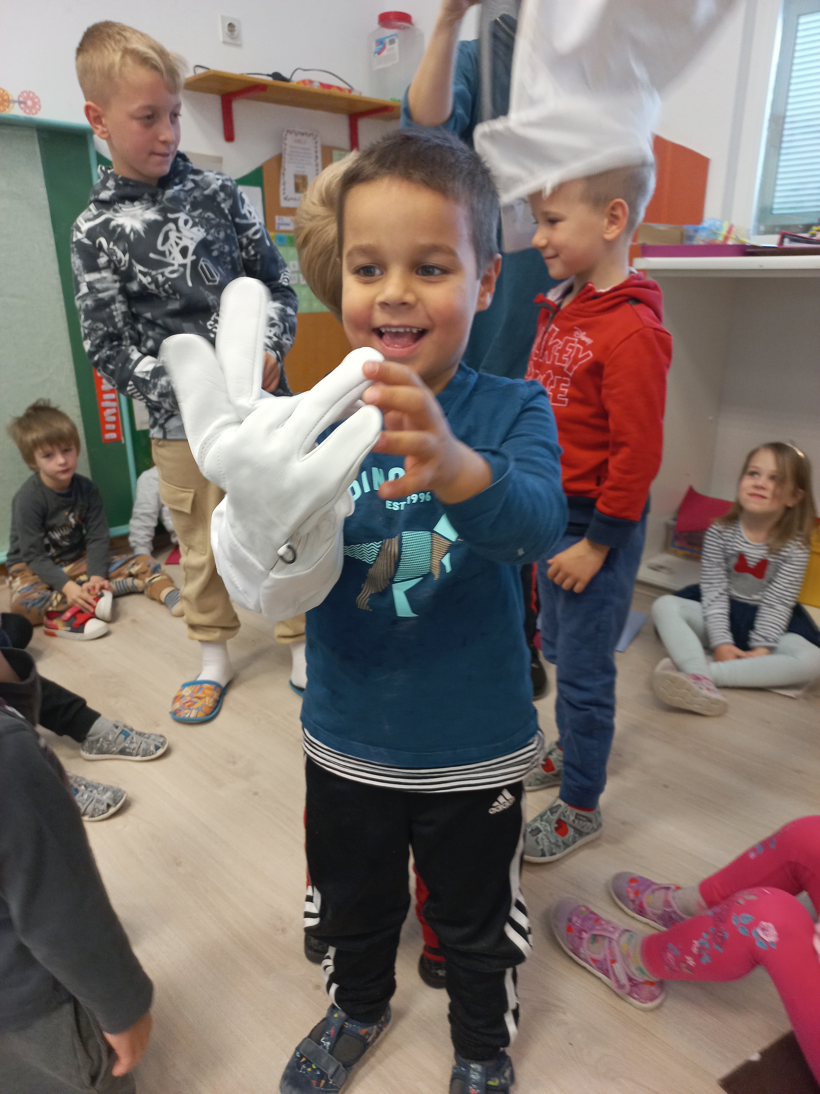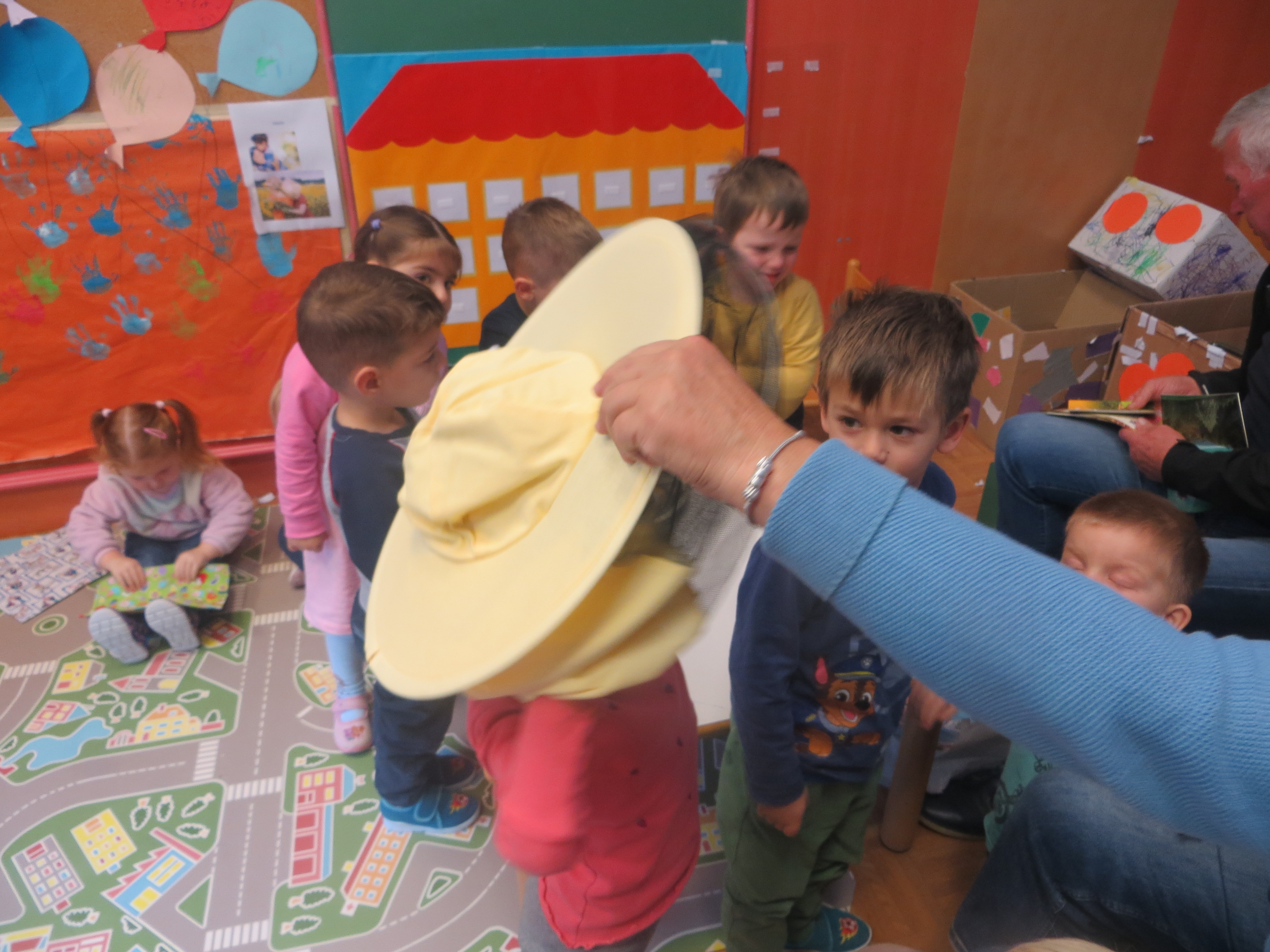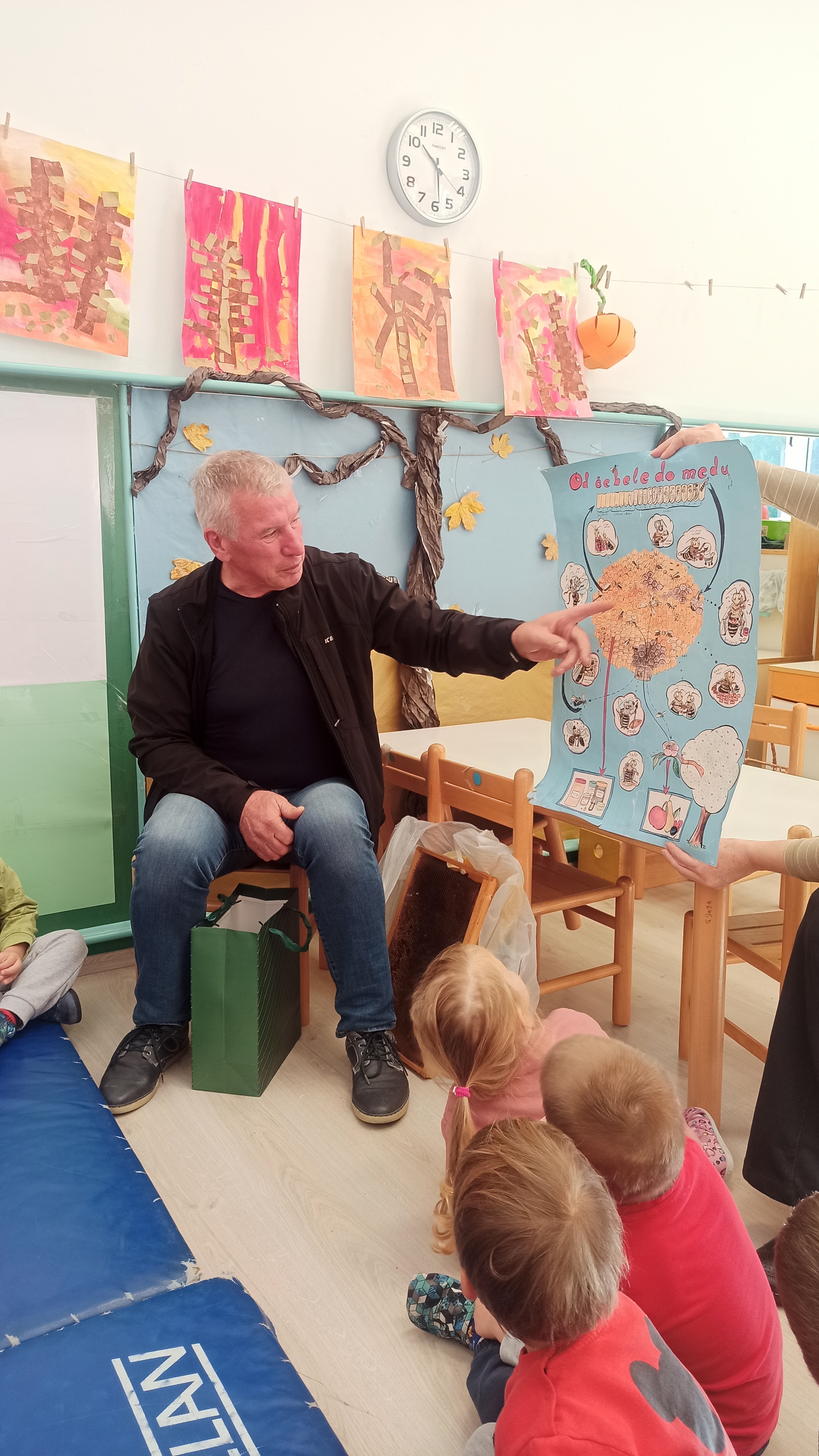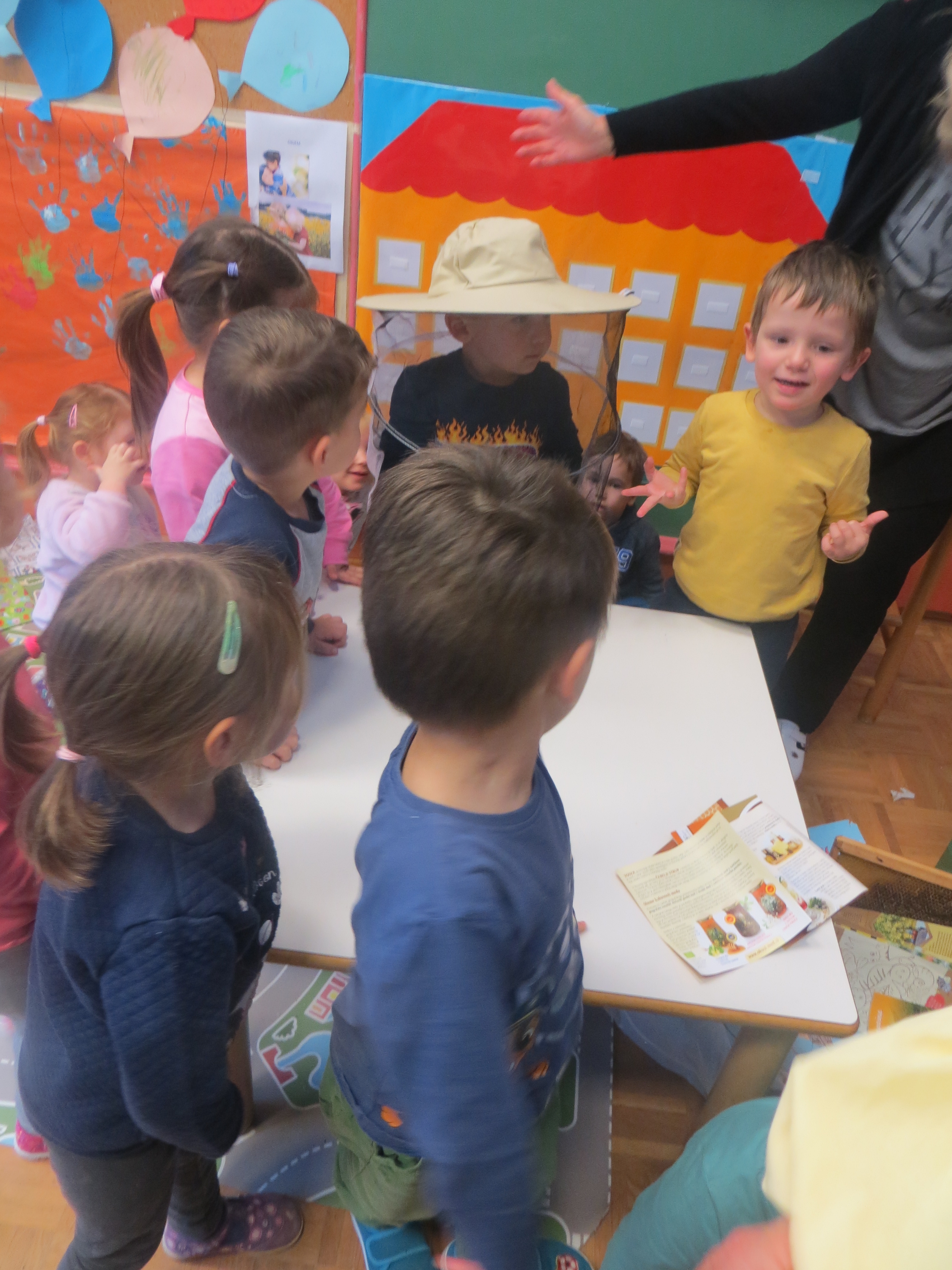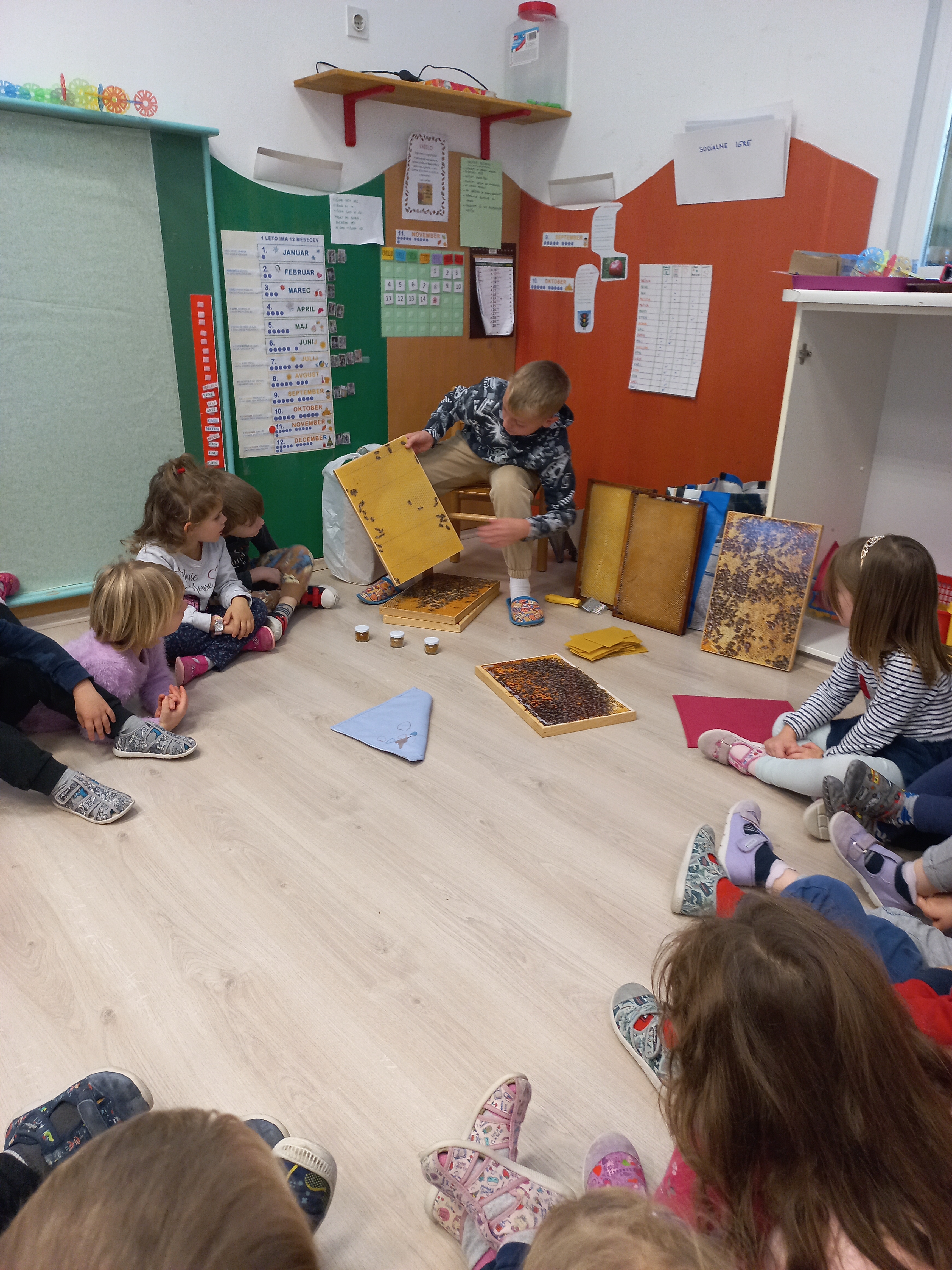 Rumeno skupino pa je obiskal mladi čebelar Timotej, ki je delo čebelarja predstavil skozi otroške oči. Poleg ostalih pripomočkov nam je razkazal otroško čebelarsko obleko, ki je sestavljena iz kombinezona, naglavne maske in rokavic. Nekateri otroci so si jo navdušeno oblekli. Spoznali smo tudi, kako čebele pridelajo zdrav matični mleček ter ga imeli možnost preizkusit. Postregel nam je tudi z zdravimi bonboni, ki jih je pripravil iz domačega medu in mandarin.