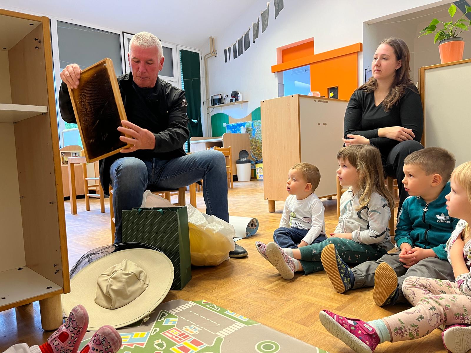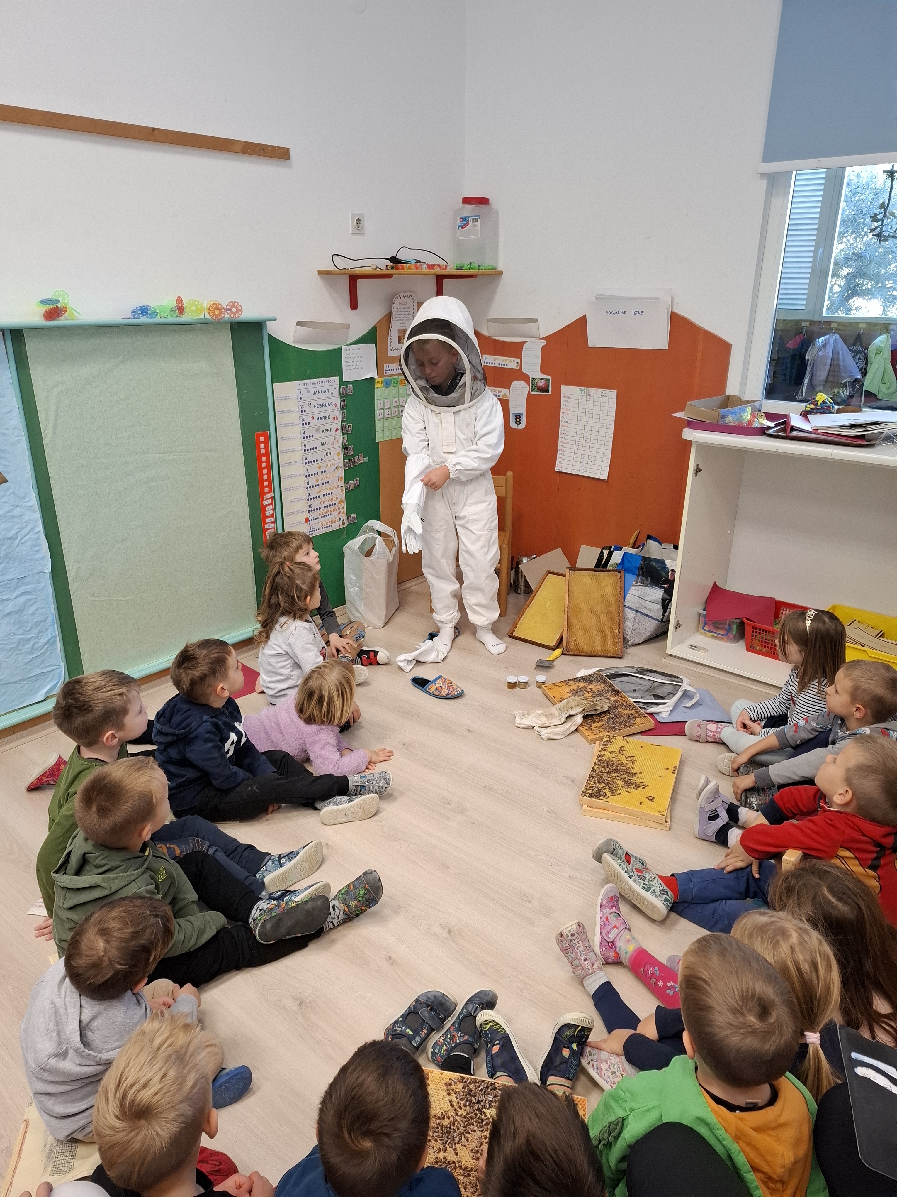 Po zajtrku sta sredinske skupine obiskala čebelarja, ki sta predstavila pomen čebel za človeka in naravo. Čebelar Oskar je otrokom pokazal raznolike čebelarske pripomočke, prav tako pa so otroci lahko preizkusili čebelje pridelke. Vsak otrok si je lahko nadel tudi pravi čebelarski klobuk.