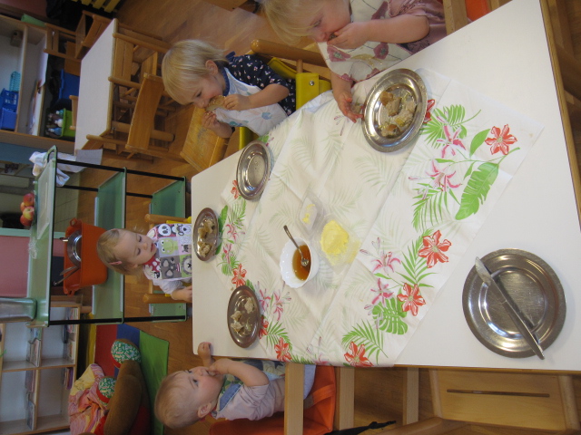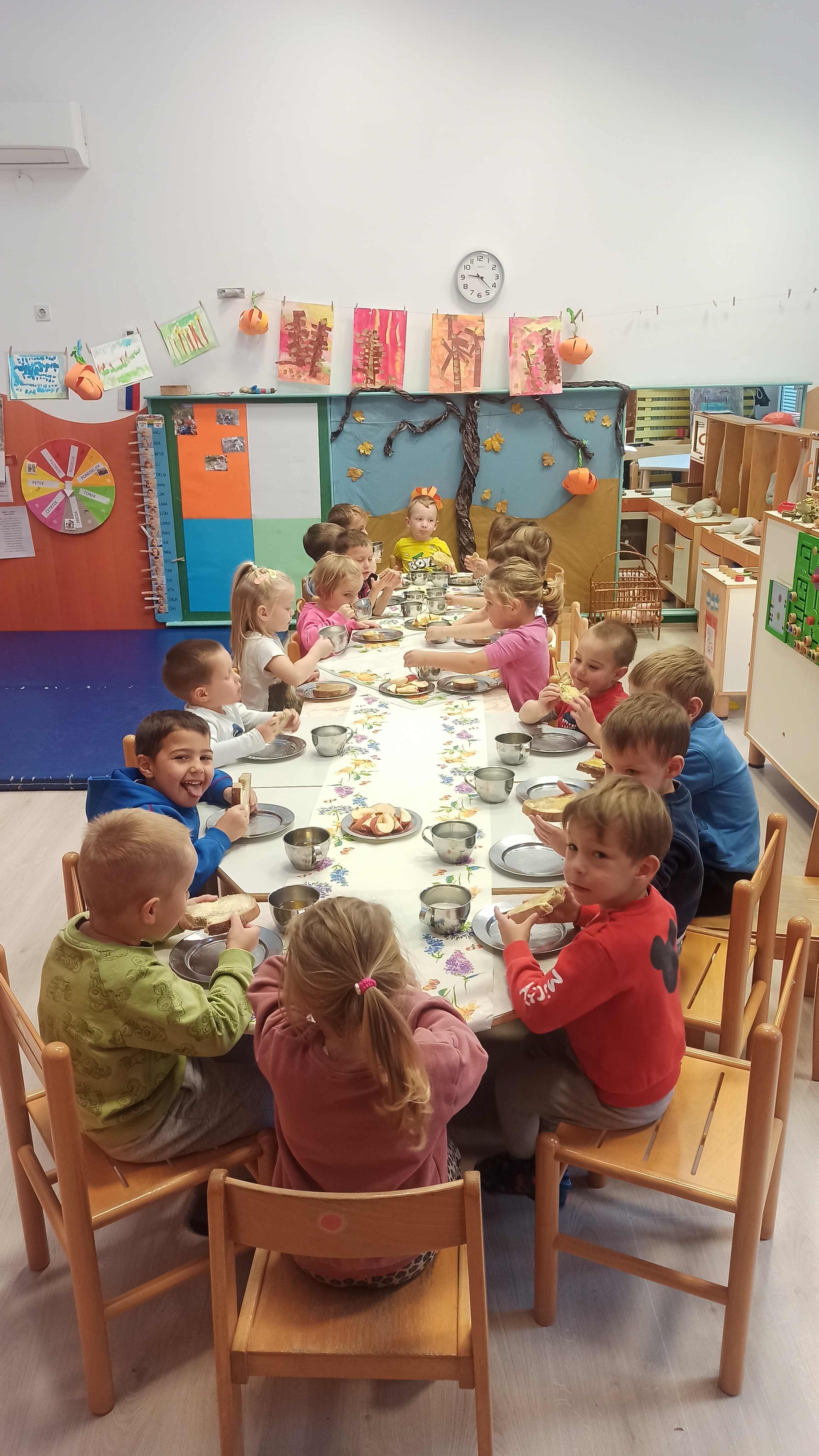 V Tednu slovenske prehrane smo v petek, 15. 11. 2024, vse skupine vrtca Dobrovo obeležile Tradicionalni slovenski zajtrk. V skupinah smo praznično okrasili mizo, ponekod smo zapeli slovensko himno nato pa smo si vsi skupaj privoščili zajtrk iz domačih lokalnih pridelkov (kruh, med, maslo, jabolka, mleko). V beli skupini so se na ta dan pripravljali že cel teden, saj so iz domačih sestavin pripravili palačinke, jabolčni zavitek in kruh.