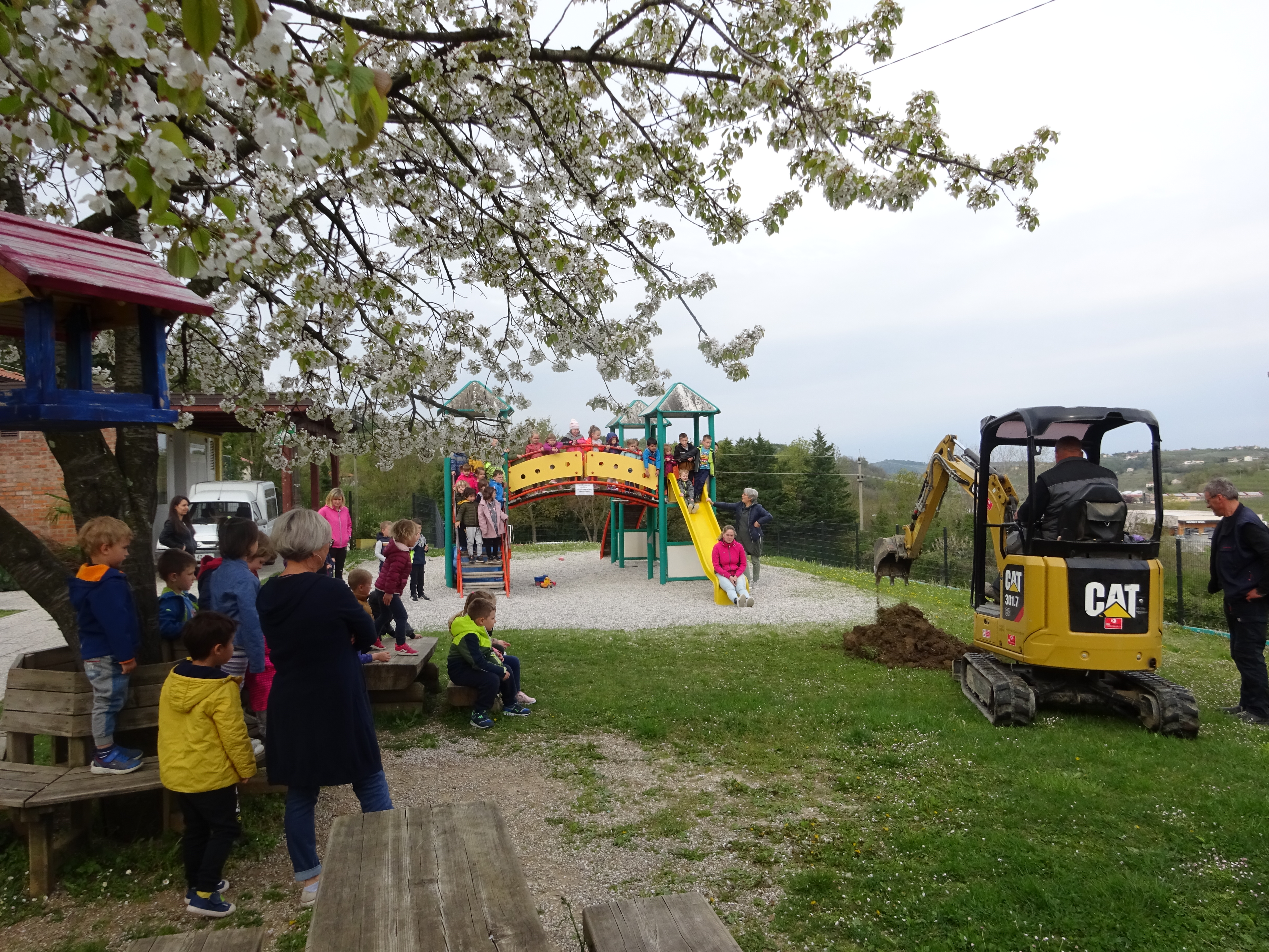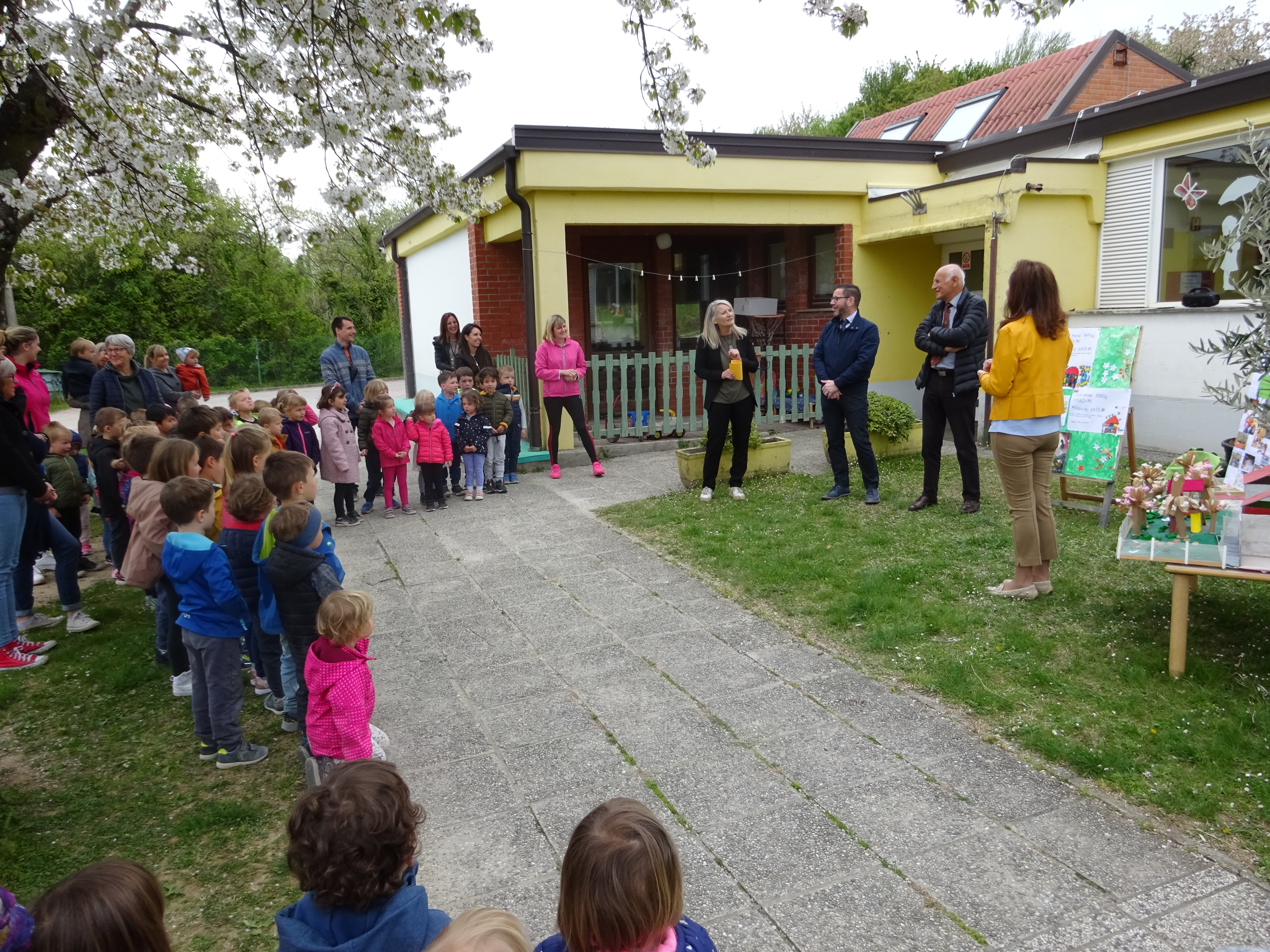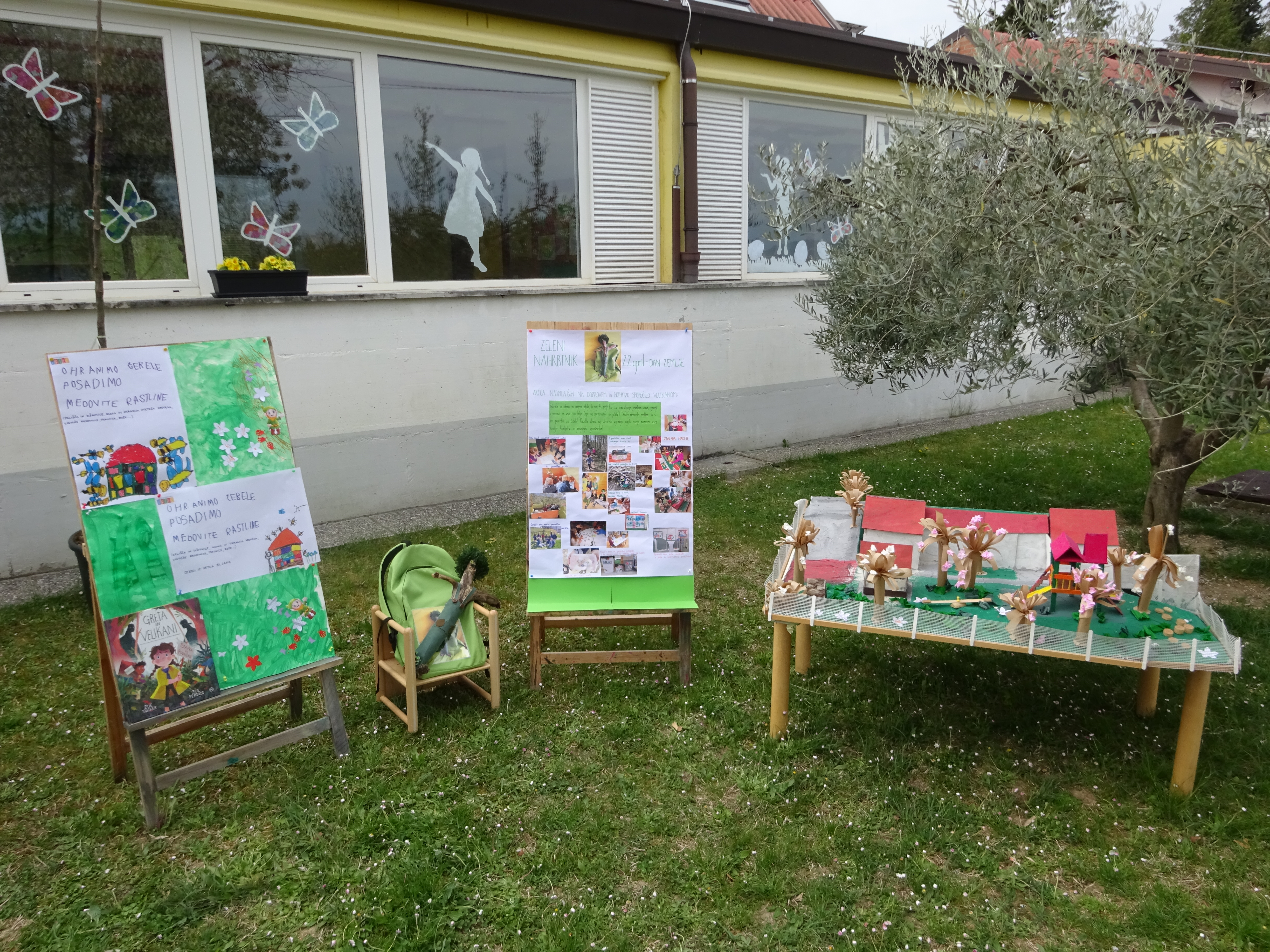 V sklopu projekta Zeleni nahrbtnik 2022 nas je obiskal Zeleni škrat ter nas skupaj s slikanico Greta in velikani popeljal v razmišljanje o našem okolju. Z namenom, da bi nam le-to postalo prijaznejše, smo izvedli kar nekaj aktivnosti: očistili smo bližnje gozdičke, se naučili ločevati odpadke ter pričeli varčevati z vodo in brisačkami. Spoznali smo, zakaj so koristne medovite rastline in jih na atriju tudi posadili. Izdelali smo maketo vrtca z igriščem polnim dreves, ki bi nam lahko nudila čist zrak, zaščito pred soncem v poletnih dneh, ptičkom pa varno zavetje. Maketo in plakate z vsebino naših aktivnosti smo predstavili tudi našim Velikanom. Ob dnevu zemlje so se z veseljem odzvali našemu vabilu in tako prisostvovali k simbolični posaditvi drevesa. Sledila je pogostitev, ki smo jo otroci sredinskih skupin sami pripravili. Imeli smo se zelo lepo.